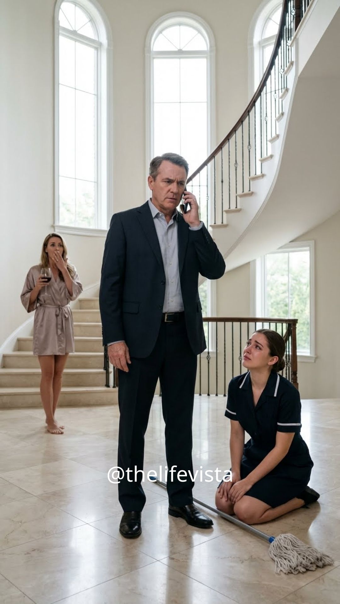 A woman in a faded gray uniform was scrubbing the marble floor near the staircase, her movements slow and mechanical. Her back was hunched, her hair tied loosely as if she hadn’t bothered fixing it in days, and her hands trembled with exhaustion. I almost greeted her politely—until she lifted her face.