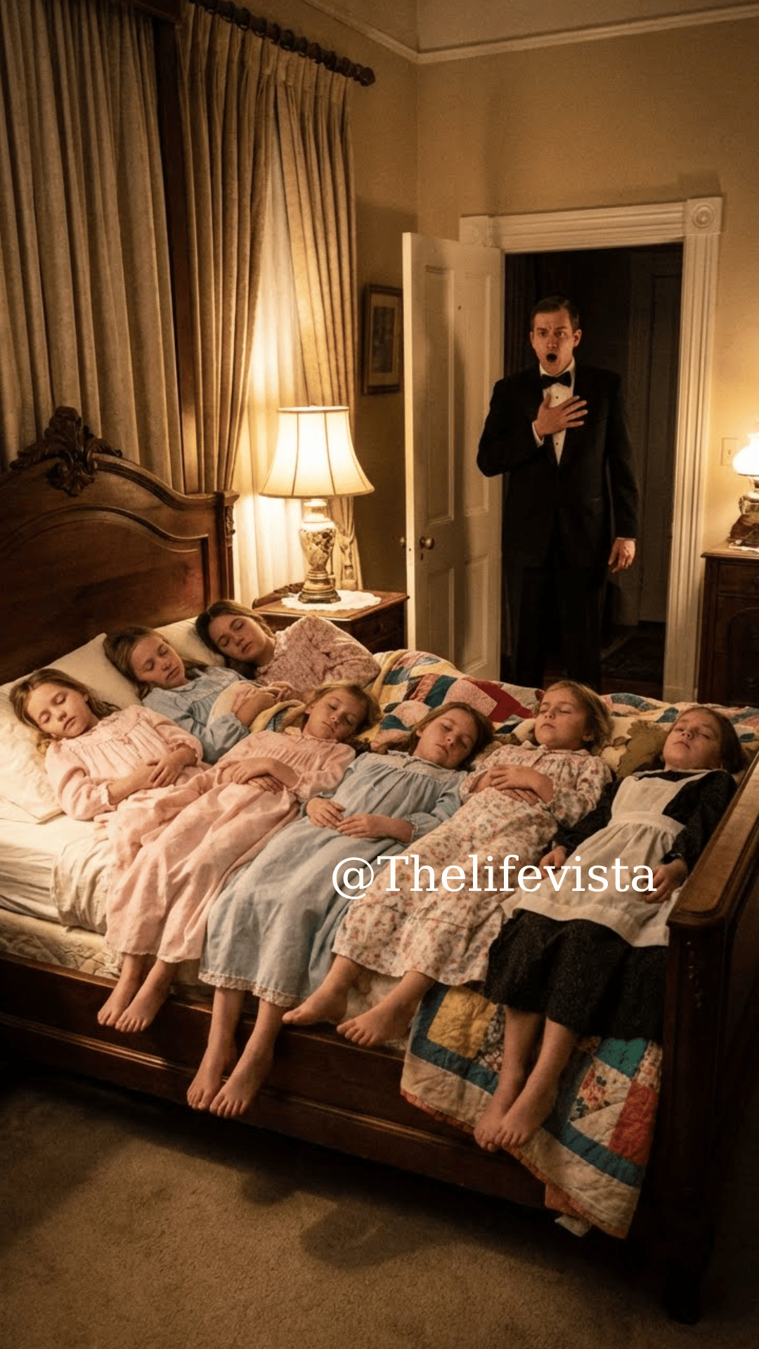 Six girls stood watching from the stairs. Emma, twelve, her posture rigid. Olivia, ten, pulling at her sleeves. Ava, nine, eyes darting. Grace, eight, pale and quiet. The twins Lily and Ella, six, smiling with too much intention. And Mia, three, clutching a torn stuffed rabbit.