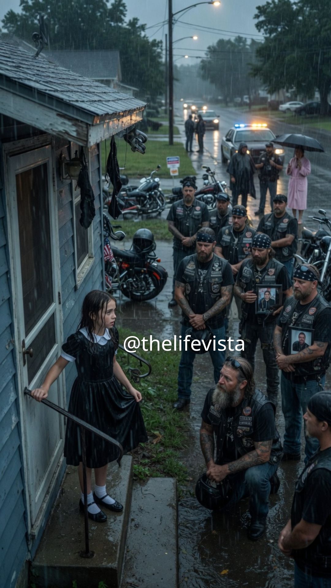Phones appeared almost instinctively in people’s hands while soft murmurs of confusion and unease floated through half-open windows, hearts beating faster with unspoken worry. One voice whispered that the scene did not look right at all while another expressed a deeper unsettled feeling that something significant was unfolding right in the heart of their peaceful neighborhood. Outside, the riders dismounted quietly with leather jackets darkened by the steady rain and boots hitting the wet pavement with dull, heavy sounds. They did not cluster together like a group arriving at a loud event and instead formed a loose but orderly line along the sidewalk directly in front of Lily Harper’s house, spacing themselves out deliberately and facing forward with complete stillness that spoke of shared grief and respect.