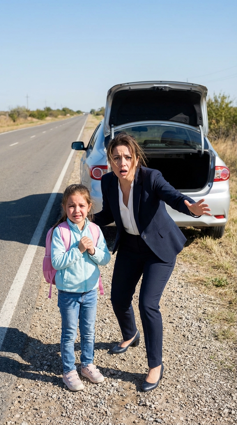 When I pulled up to the spot, my heart lodged in my throat. There she was, my little girl, standing alone, clutching her backpack to her chest like a shield, her eyes red from crying. The road was empty, the air heavy, and the space around her felt like a punishment. She looked so small against the bleak stretch of asphalt.
