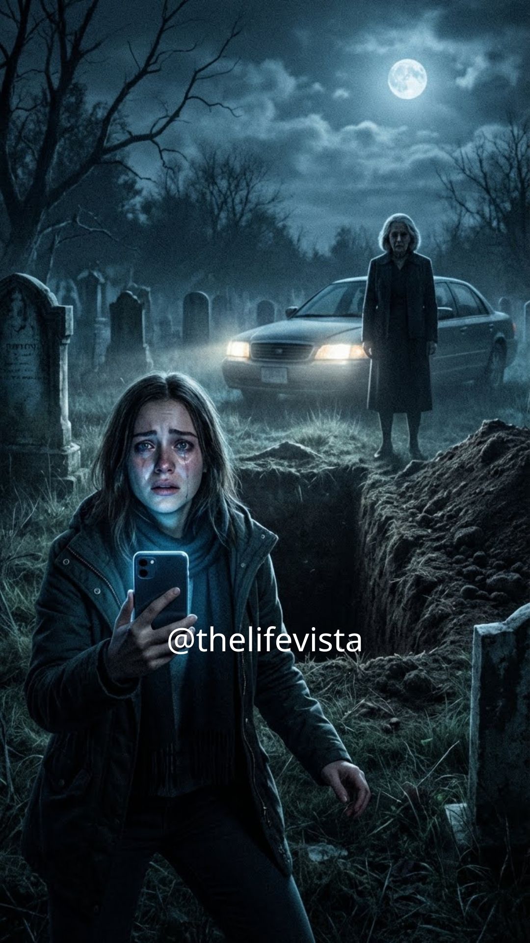 She turned slowly, her face pale under the cemetery lights. She was in her late fifties, hair pulled back tightly, eyes darting around as if she expected someone else to appear.