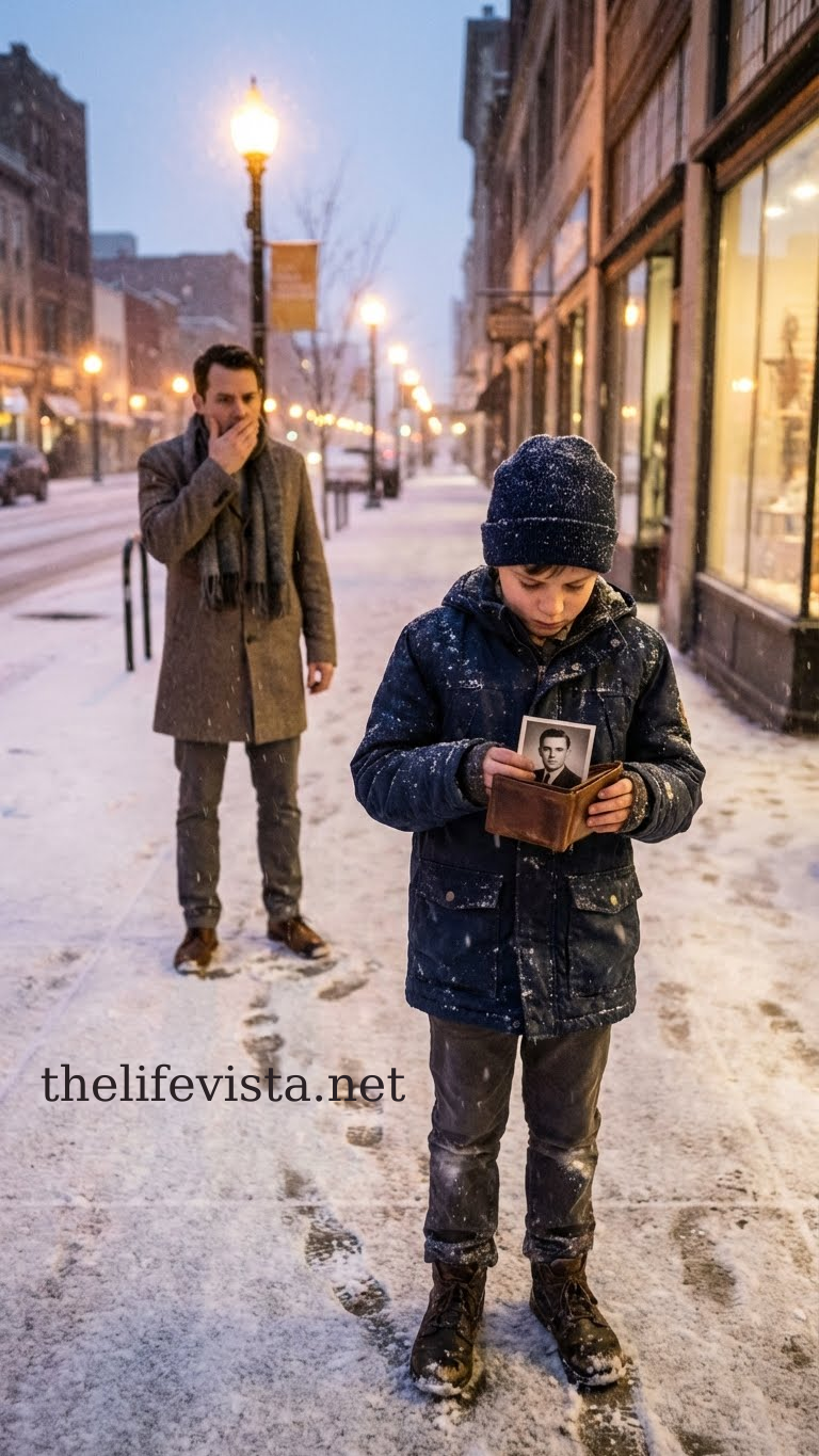 He picked it up, brushing off the snow, and glanced around. The street was busy, people rushing past, none noticing him. He opened the wallet carefully. His heart skipped a beat—not at the cash, which was plentiful, but at a photograph tucked in a hidden flap. The photo showed a small boy with strikingly familiar blue eyes, messy brown hair, and a shy smile. Jason froze. Those eyes… that smile… it was like looking in a mirror.