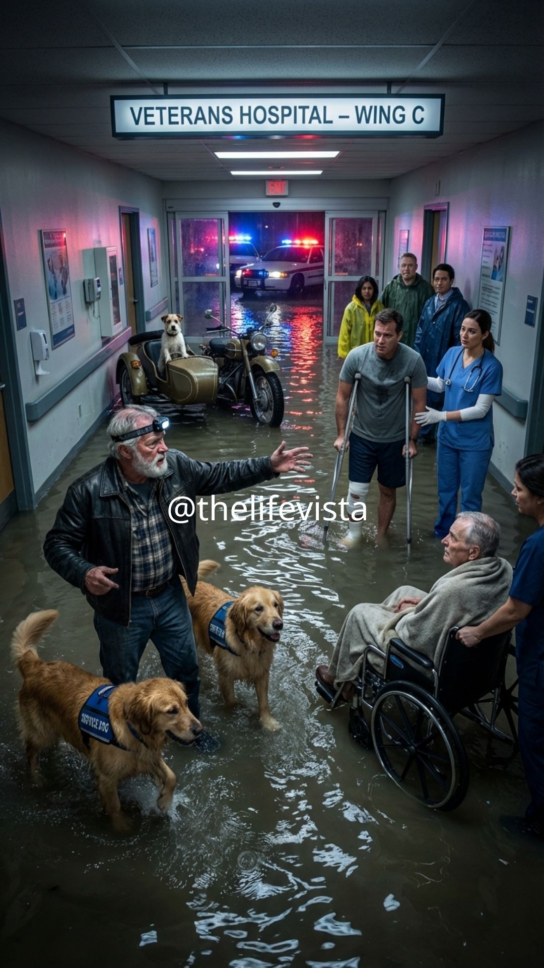 Golden retrievers navigated the darkness with calm focus, guiding frightened patients through flooded corridors and alerting nurses when someone began to panic or struggle to breathe. They carried medical supplies in specially designed packs strapped gently across their backs. They even found patients who had become disoriented in dark hallways filled with rising water.