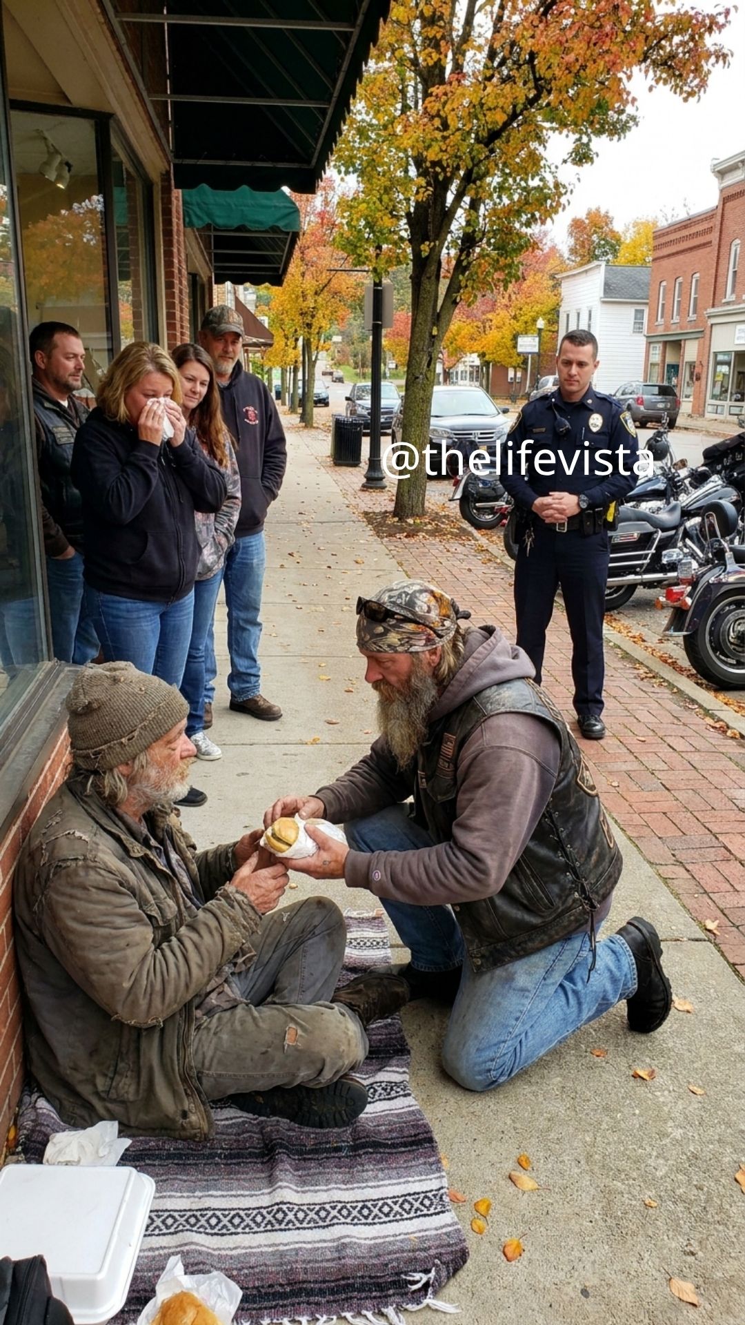 Jack Mercer reached into a saddlebag attached to his bike and pulled out a container, the kind used for takeout, still faintly warm. He opened it without ceremony, revealing a full meal — untouched, clearly recent. He set it gently on the curb between them, not pushing it forward, not insisting, just placing it there as an option.