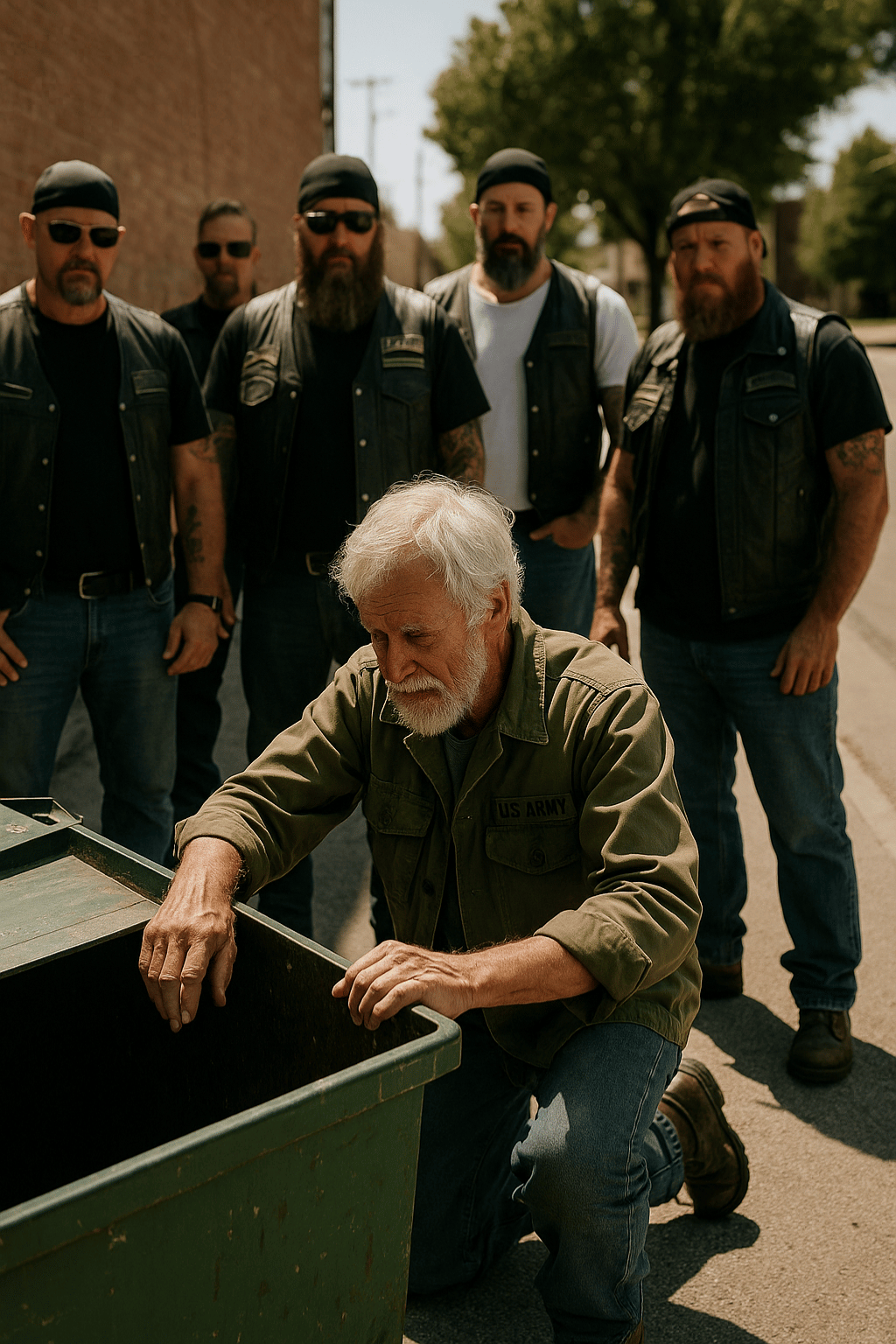 An elderly man, hunched beneath the morning sun, was lifting the lids of trash bins one by one. Not with the frantic energy of desperation, but with the slow, practiced precision of a man who had once been trained to do everything methodically.