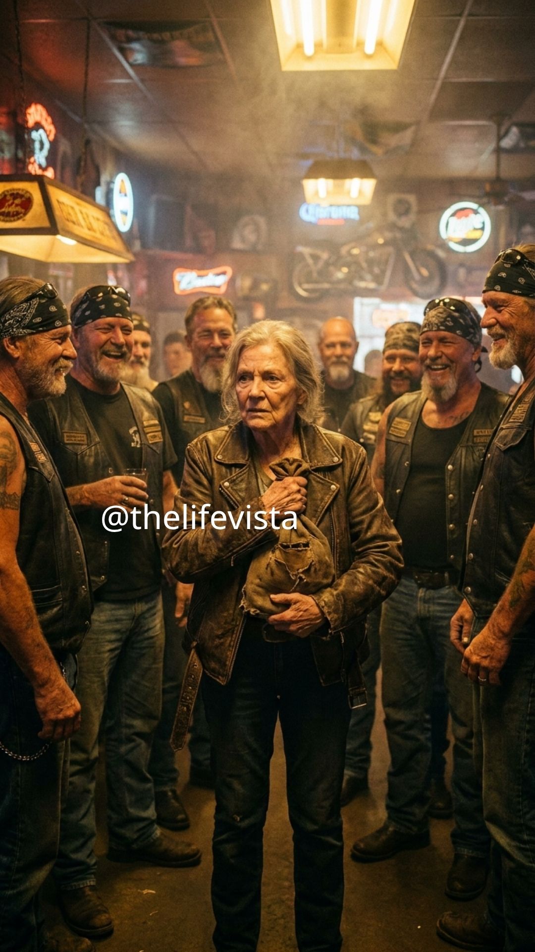 An old woman walked into a biker bar carrying something no one there was ready to see, and within seconds, the atmosphere began to shift in ways the men couldn’t yet explain. At first glance, she looked out of place—small, alone, and far too calm for a room built on noise and intimidation. But before the night was over, she would turn laughter into silence and silence into fear.