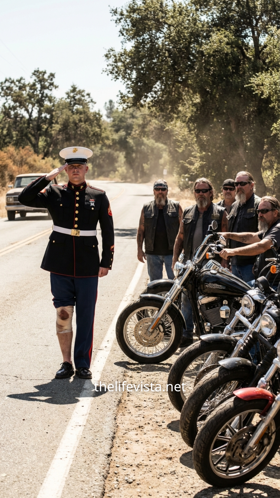 The bikers swung off their motorcycles, boots striking the pavement with heavy, deliberate thuds. One after another, they dismounted, forming a loose line. Then they began to move—slowly, intentionally—toward the lone, exhausted Marine.