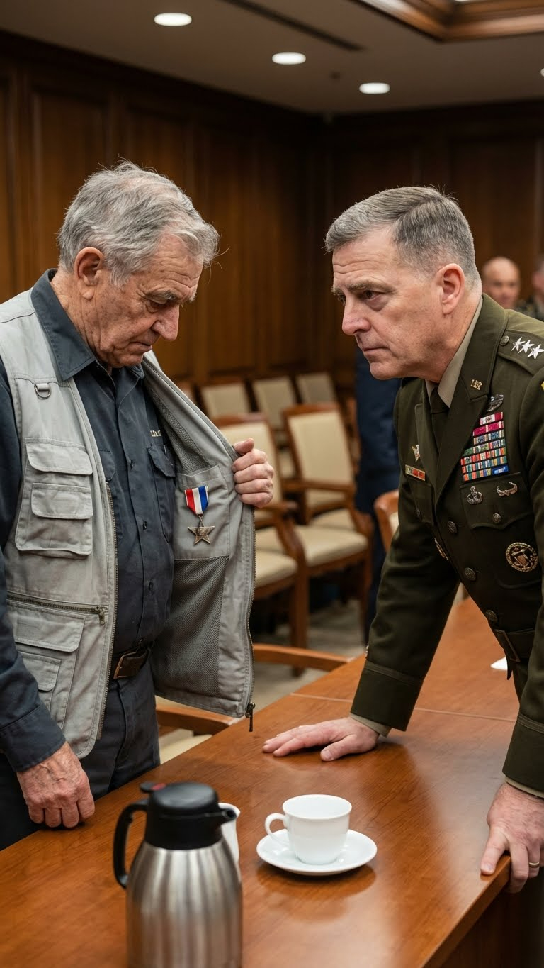For fifteen years, Frank Morrison drifted through the corridors of the Pentagon like a shadow. To the powerful generals waging wars from offices along the E-Ring, he was nothing more than an elderly man pushing a squeaky coffee cart—an invisible presence dismissed by hurried officers who never bothered to learn his name. That illusion shattered the instant General Marcus Hale, Chairman of the Joint Chiefs of Staff, noticed a faded Silver Star tucked beneath Frank’s service vest.