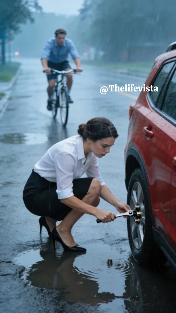 Daniel checked the time—6:54 a.m. Every rational thought told him to keep driving, but something stronger made him stop. He rolled down the window and asked if she needed help. She turned around, dark hair pulled back, calm eyes hiding clear distress. She said yes, she had a flat tire and didn’t know how to change it. Daniel parked immediately, grabbed his jack, and knelt beside the car, assuring her it would only take ten minutes. As he worked, she watched him quietly, studying him. She asked if he was in a hurry. He told her he had court, something very important. She sighed and admitted it was her first day at a new job and she was already late.