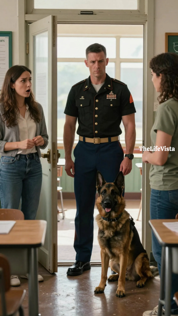 He entered without raising his voice, his presence steady and composed, accompanied by a dog that moved with quiet discipline at his side. The students fell silent immediately, their attention drawn not by fear but by the unmistakable sense that something important was happening. Elena looked up and froze, recognition spreading across her face as she realized who stood in the doorway. He greeted her gently before turning toward the teacher, his expression calm but firm. When he spoke, his words carried clarity that filled the room without needing volume.