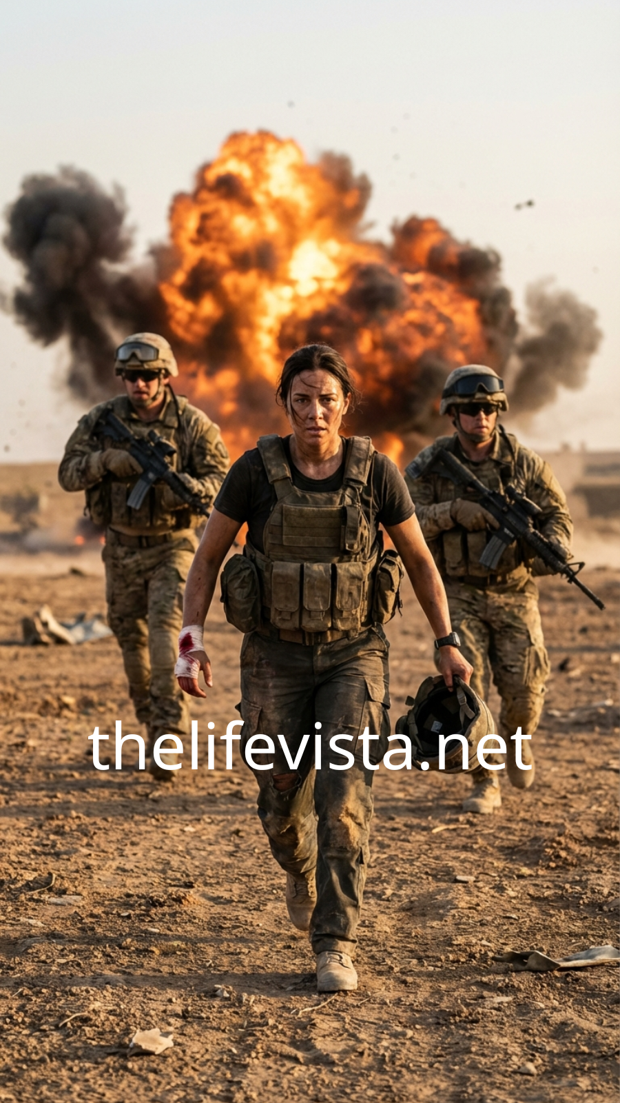 She dragged Daniel behind a crumbling rock wall, cinched a tourniquet high and tight, and packed the wound while bullets snapped overhead. Then she moved to Leo, sealing the abdominal injury with hands that trembled—but never lost precision. Blood soaked through her gloves. The noise, the dust, the chaos pressed in from every direction.