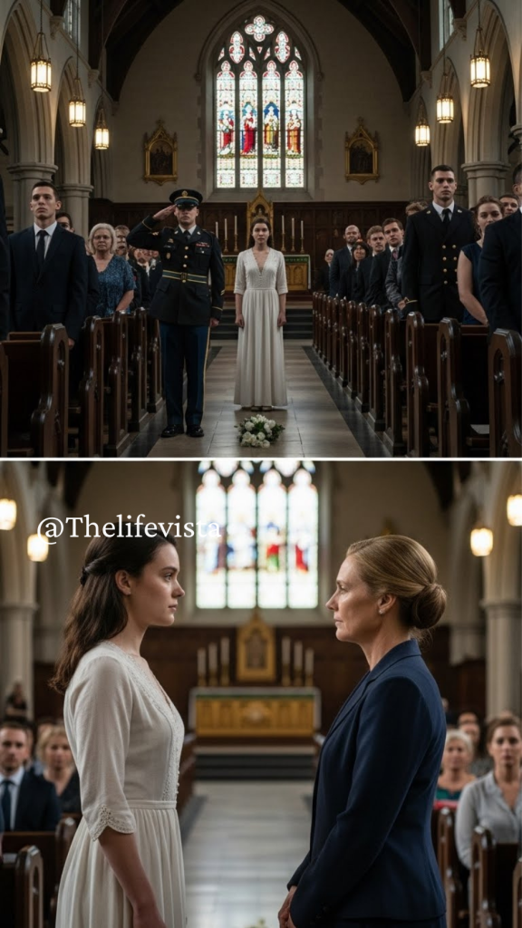 Her plain white gown, no frills or lace, clung to her frame, chosen because it felt honest, not because it screamed wealth. Her dark hair, pulled back, simply framed a face that carried no makeup, just the raw flush of shame. The guest’s laughter echoed sharp and cold, cutting through the sacred quiet of the sanctuary.