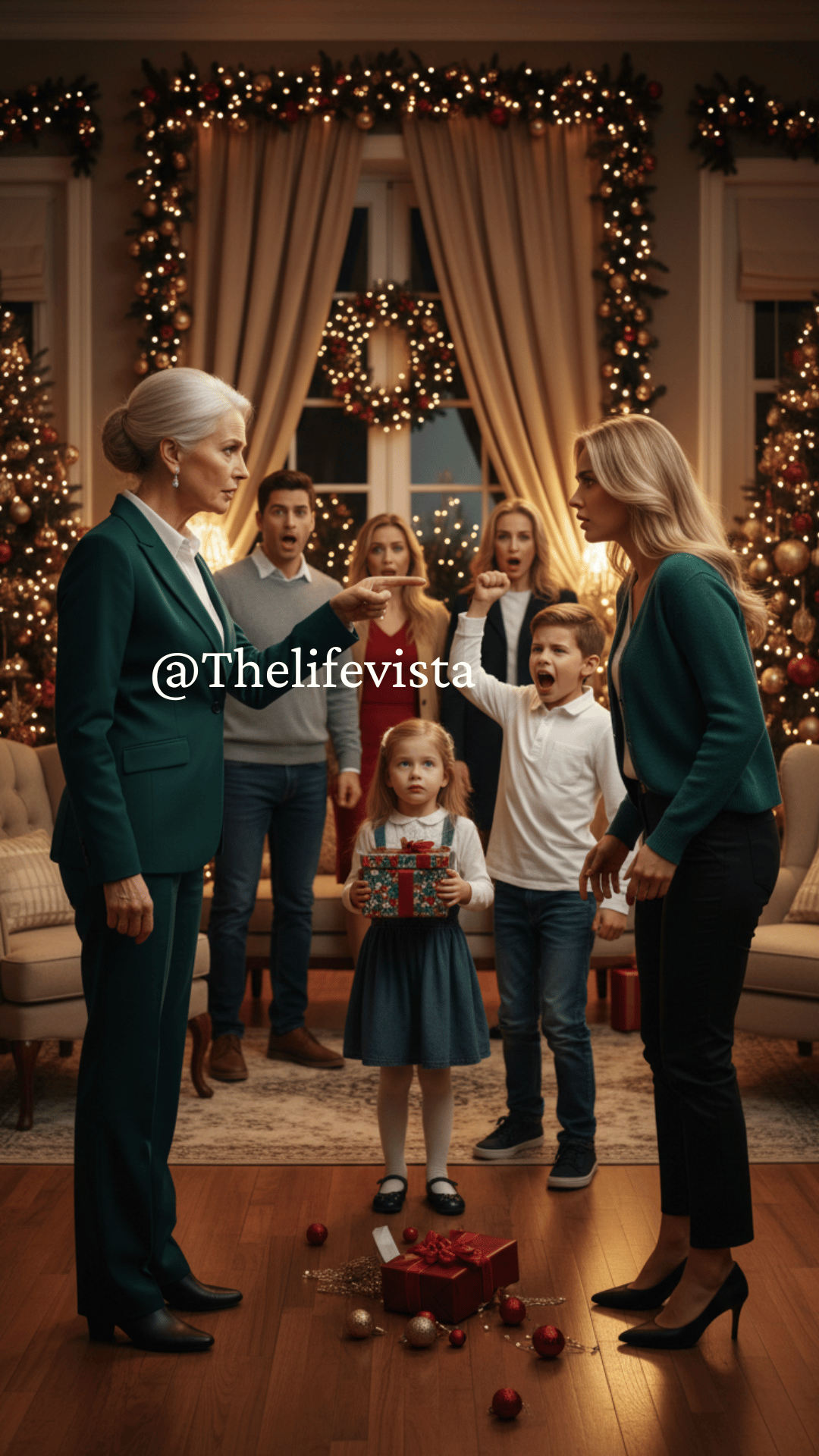 At Christmas, my mother-in-law looked at my six-year-old daughter and said, “Kids born from your mother’s cheating don’t get to call me Grandma.” She said it right after rejecting the handmade gift my daughter brought her. Then my son stood up… and whatever he said made the entire room fall into a terrifying, breath-holding silence.
