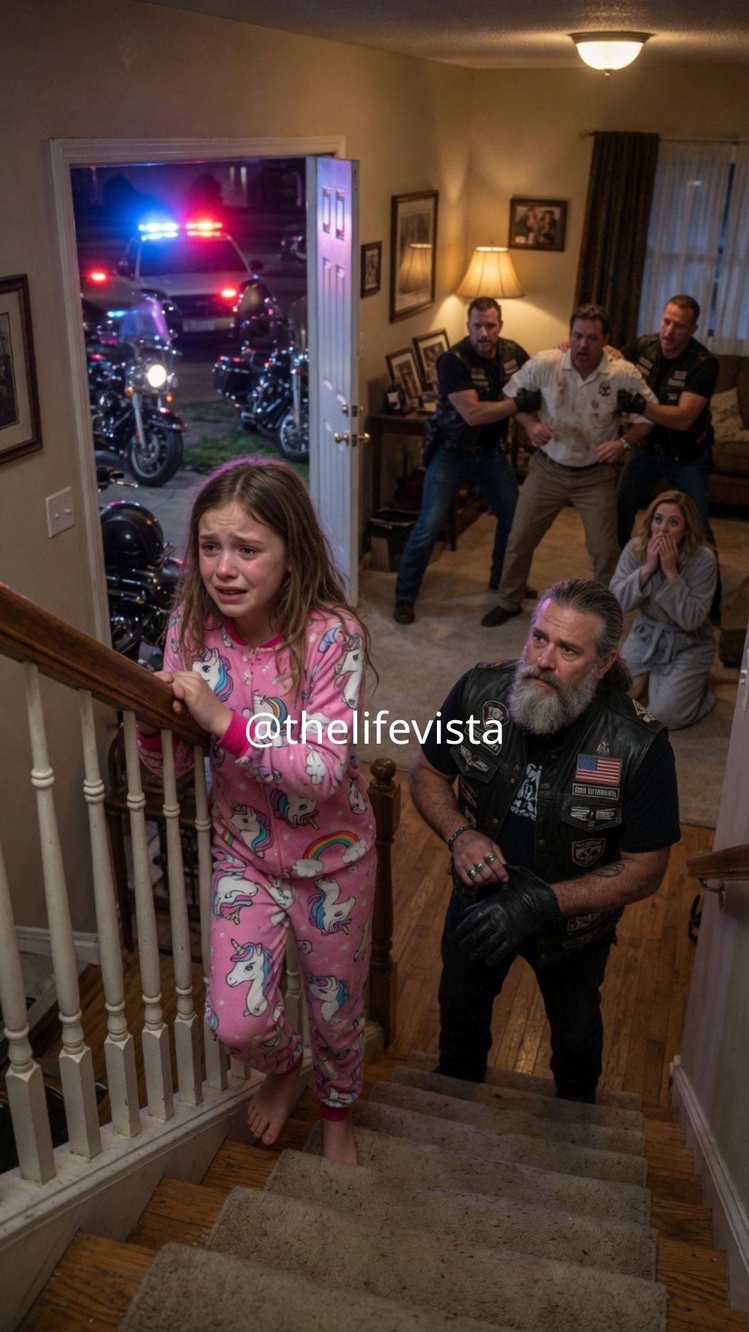 The bikers tensed instantly, a ripple of leather and barely contained steel moving through the group. But the leader didn’t move an inch. He just looked past my furious husband, his gaze fixed on the top of our staircase. I turned slowly and followed his line of sight. Lily was standing there in her favorite unicorn pajamas, her small hand gripping the railing tightly. She wasn’t looking at me, or at her father. She was looking at the biker. And for the first time in weeks, she didn’t look scared. She looked safe.