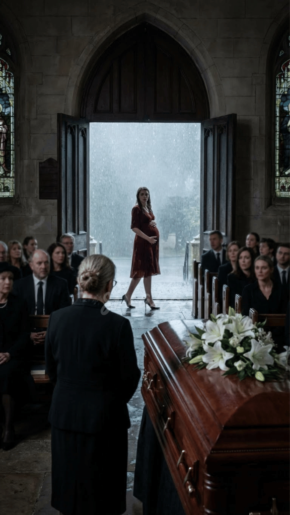 She wasn’t wearing black. She was wearing a dress that was too tight, too short, and a shade of crimson red that screamed for attention. It was a dress meant for a nightclub, not a funeral. But the most prominent feature—the thing that made the congregation gasp in collective horror—was her stomach.