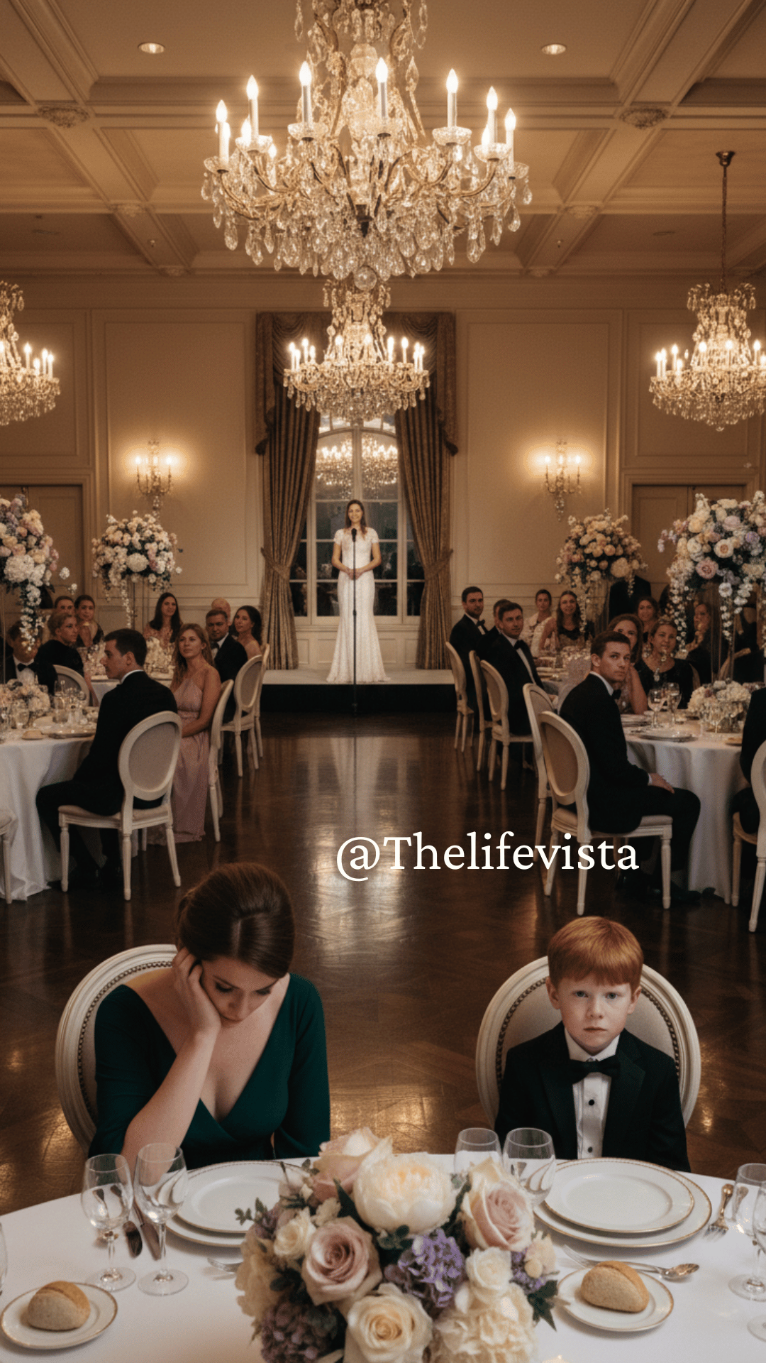 At my sister-in-law’s wedding, I noticed my place card said single mother server, and a wave of laughter spread across the table. My mother-in-law joked loudly, calling me a leftover they decided to use for the night. Before I could react, my 8-year-old son stood up, walked to the microphone, and said he had a special message for the bride. As soon as he began to speak, the entire hall went silent and her smile slowly faded.