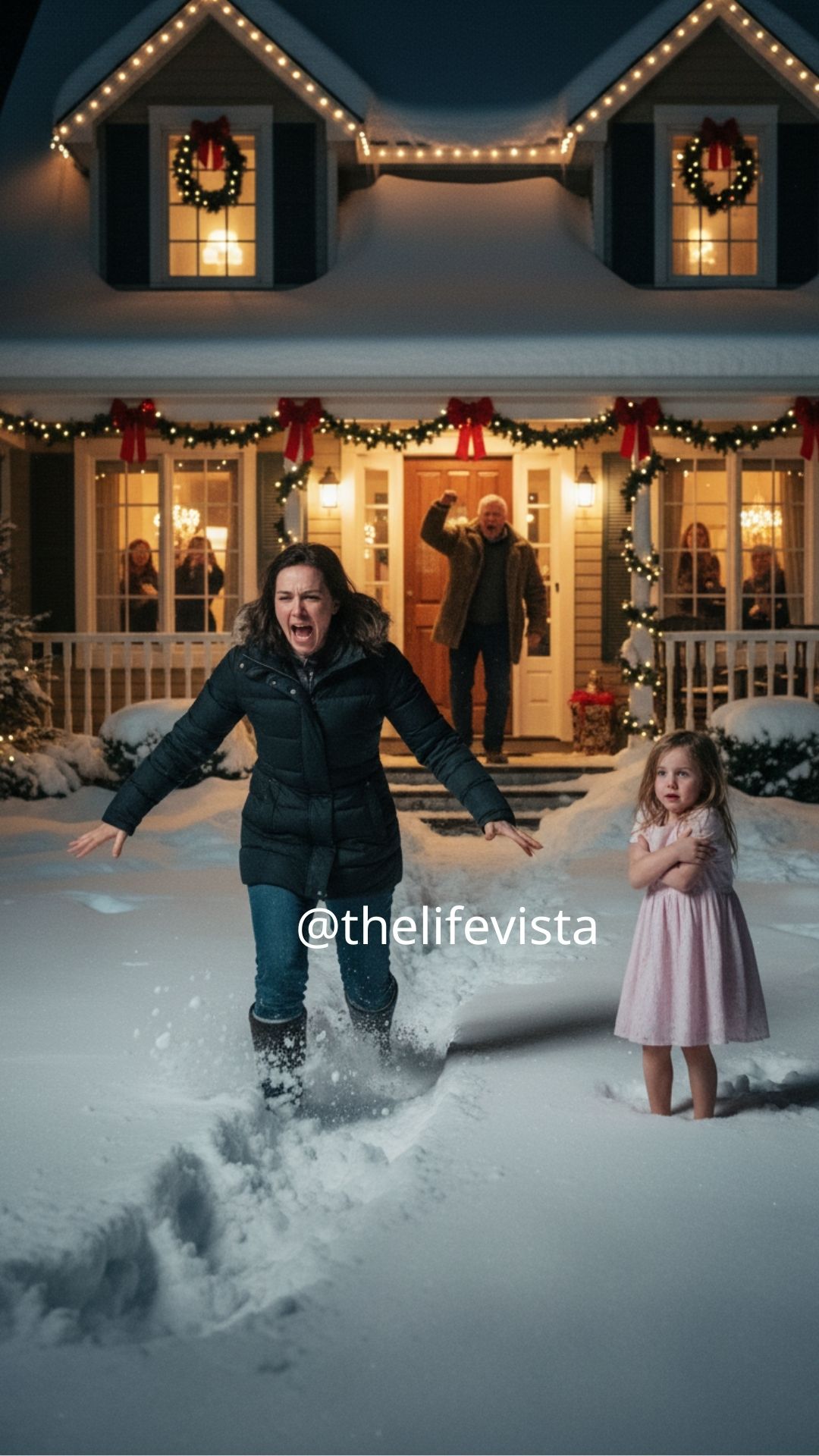 I found the side door, flung it open, and the cold hit me like a slap. Ava stood in the snow near the front window, shaking so violently I could hear her teeth chatter from ten feet away. Her feet were bright red, almost purple in patches. The snow around her was stained pink where skin had cracked and bled. Her left eye was swelling shut. Her lip was split. She looked like a child who’d been dropped out of the world, and the sight of her alone out there made something inside me harden into a kind of focus that didn’t feel like rage so much as refusal.