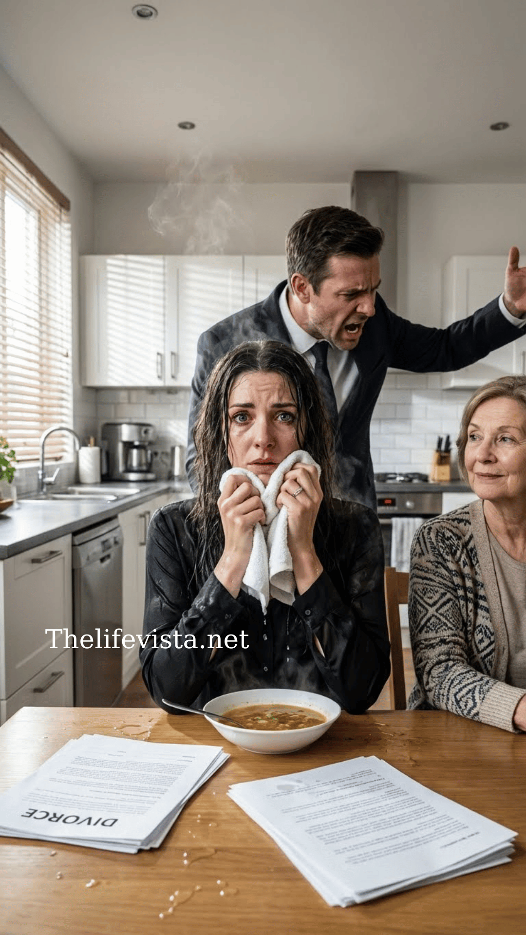 At the family dinner, my husband poured hot soup on my head while his mother laughed. Then he said, “You’ve got 10 minutes to get out.” I wiped my face, pulled some papers from my bag, laid them on the table, and said calmly, “You’re right. Ten minutes later…”