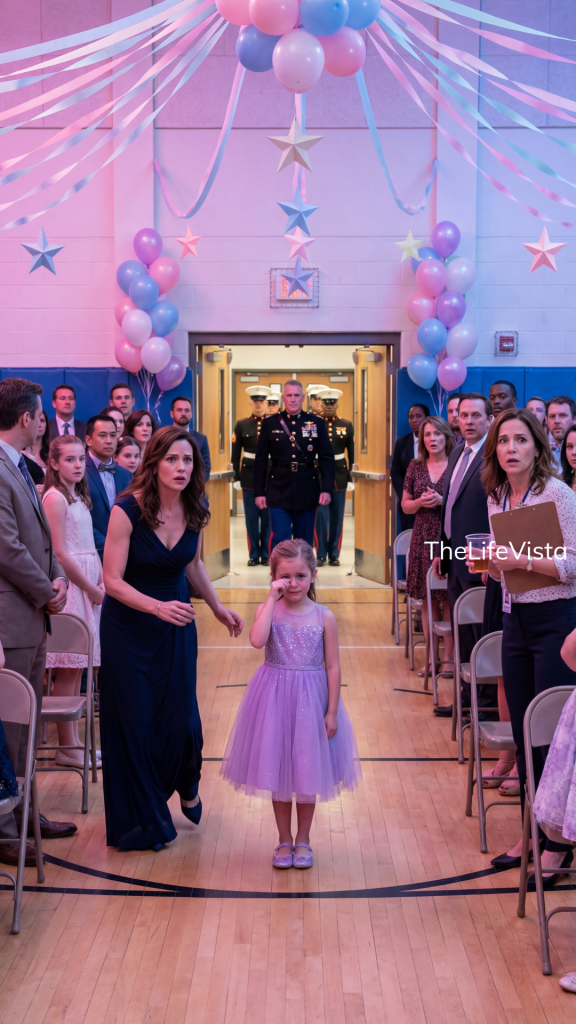 There is a difference between a group of people walking into a room and a formation entering one. What came through those doors belonged to the second category. At the front was a man in full dress uniform whose bearing altered the atmosphere before he had spoken a single word. Four stars marked his rank, and the ribbons and medals across his chest caught the overhead light in brief controlled flashes. Behind him came a line of Marines whose uniforms were immaculate and whose posture was so exact that the decorated gym suddenly felt childish and improvised by comparison. They did not pause to orient themselves, and they did not look around for permission to proceed. They stepped onto that gym floor as though they had arrived with a purpose no one else yet understood.