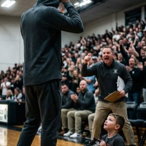 The coach sneered, pointing at my son’s torn sneakers. “Hey kid, this is a basketball court, not a trash heap. Tell your mom to buy you some real shoes before you even think about playing.” The rich kids erupted in laughter, tossing the ball in his direction. Suddenly, a tall man in a hoodie, who had been sitting quietly in the corner, stood up and walked toward us. He removed his limited edition Air Jordans and handed them to my son. As he pulled off his hood, the entire stadium fell silent, stunned. It was…