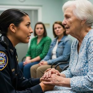 Charlotte sat by the large airport window, clutching a small bouquet to her chest, tears blurring the terminal lights into soft, indistinct stars. The flowers were modest—simple white...
