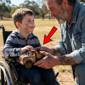 A dying 8-year-old boy in a wheelchair handed his most precious possession, a worn red toy truck, to a leatherclad stranger outside a children’s hospital, whispering that real...