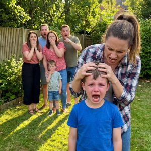 My sister yanked my son by his hair across the yard, screaming, “Your brat ruined my dress!” Mom laughed and added, “He deserved it. He needs to learn his place.” Dad joined in, chuckling, “He should apologize for existing.” I said nothing. I simply helped my son up, wiped his tears, and took him home. The next morning, police cars were parked all along their driveway. It turned out that the “brat” actually owned the house they were living in—thanks to a trust his late grandfather had set up in my name.