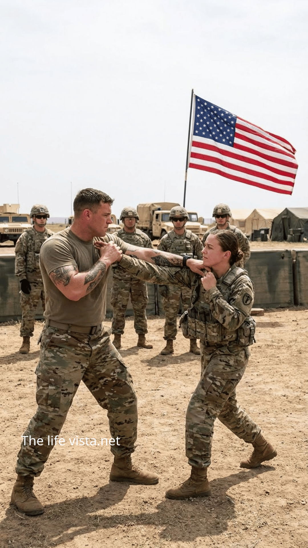 Her second demo came faster. She assumed the same wounded-medic position, but the attack came from a different angle. This time, the volunteer lunged from behind. She didn’t flinch. In a single fluid motion, she ducked, pivoted, and caught his forearm under her own. She dropped her hip in a sharp twist that pulled the attacker’s center of mass forward, using his own lunge to propel him past her. As he stumbled, she spun, locking him in a mock chokehold with her free arm, her body a stable base between his shoulders. Again, there was no flare, no smile of satisfaction. Just clinical, flawless execution.