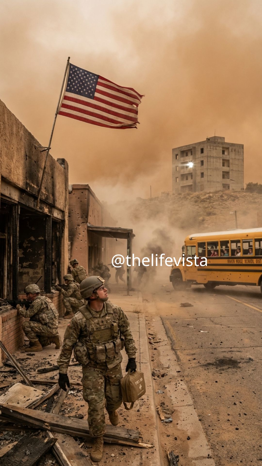The school bus sits in the middle of the street. Its yellow paint stark against the dusty asphalt. Through the windows, he can see small faces pressed against the glass. Children looking for signs of rescue. The other civilian vehicles, two pickup trucks, a minivan, and a sedan are positioned at various points along the street.