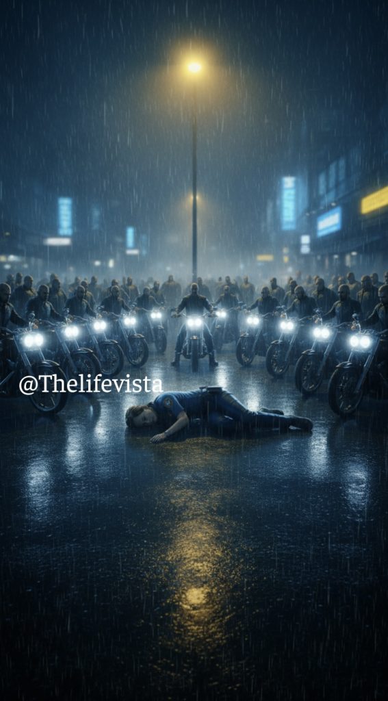 50 bikers stood in silence, their presence both intimidating and oddly comforting as they waited for what would come next. The injured officer lay at the center of their circle, unconscious, but no longer alone on the wet pavement. The rain intensified, drumming against leather jackets and chrome pipes. 50 bikers stood in an unwavering circle around Officer Grace Mitchell, their boots planted firmly on the wet asphalt.