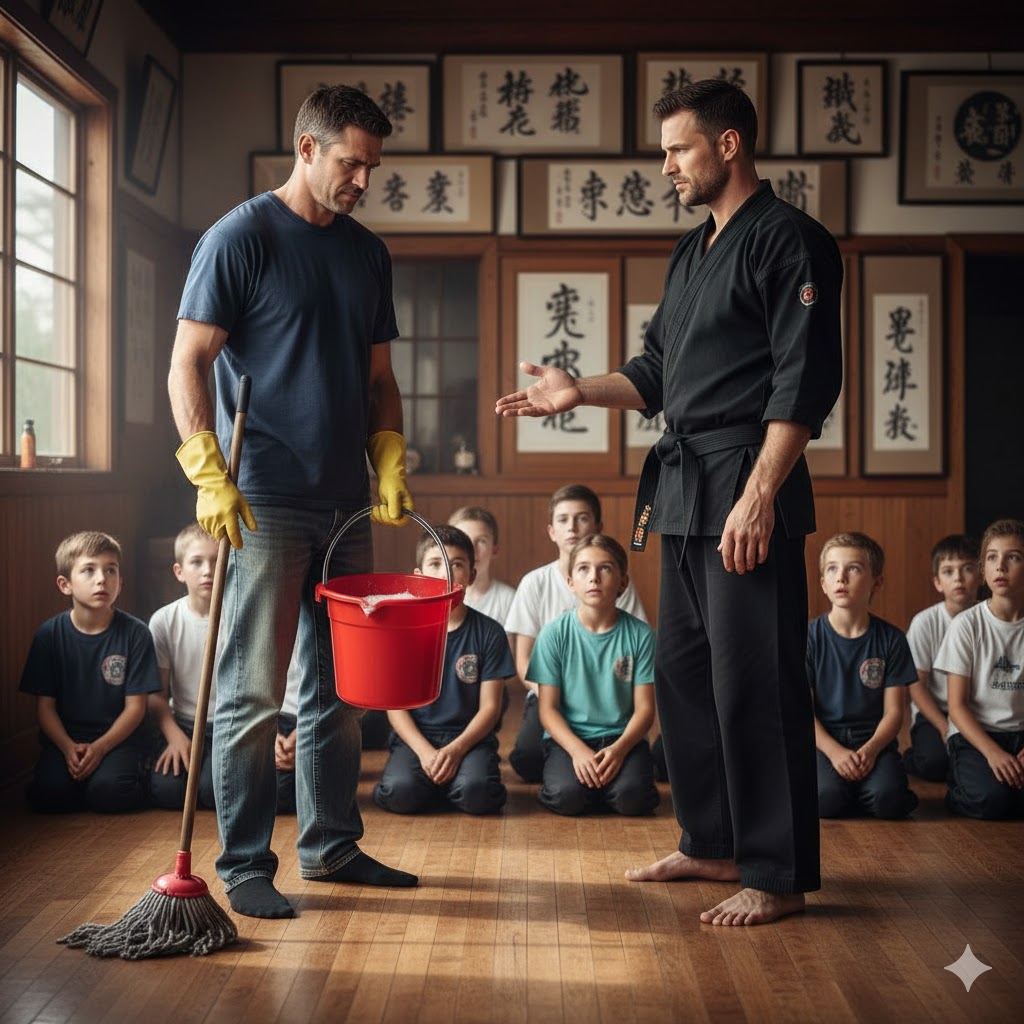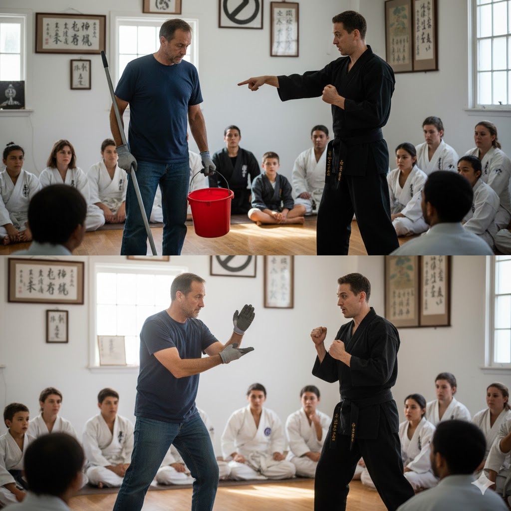 “Come on up, mop-man,” the instructor sneered, theatrically adjusting the black belt around his waist. “Let’s show the newbies what a real fighter looks like.”