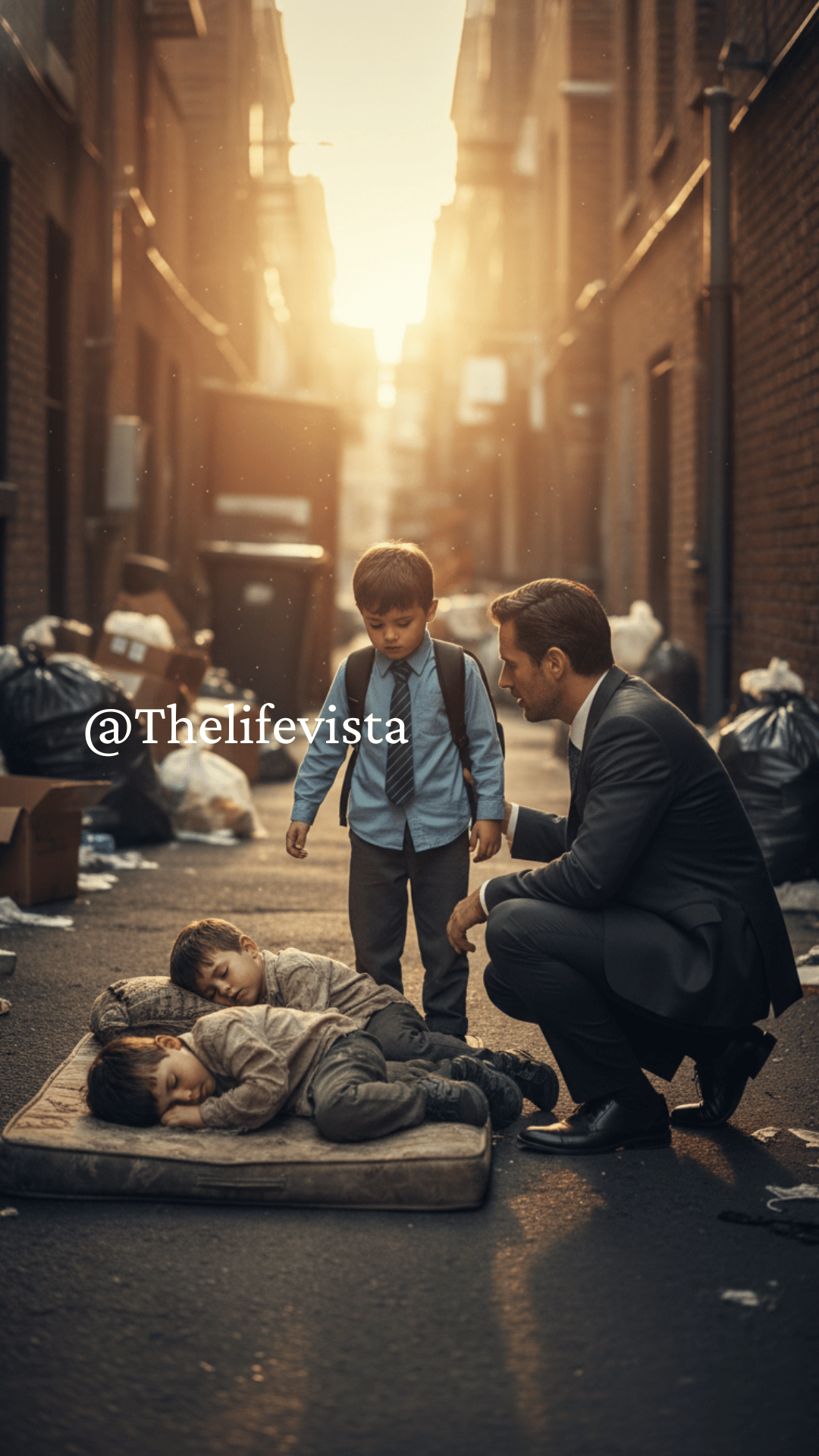 BOY SHOCKS BILLIONAIRE… “Father, those two kids sleeping in the trash look just like me,” said Pedro, pointing to the little ones curled up together on an old mattress on the sidewalk.