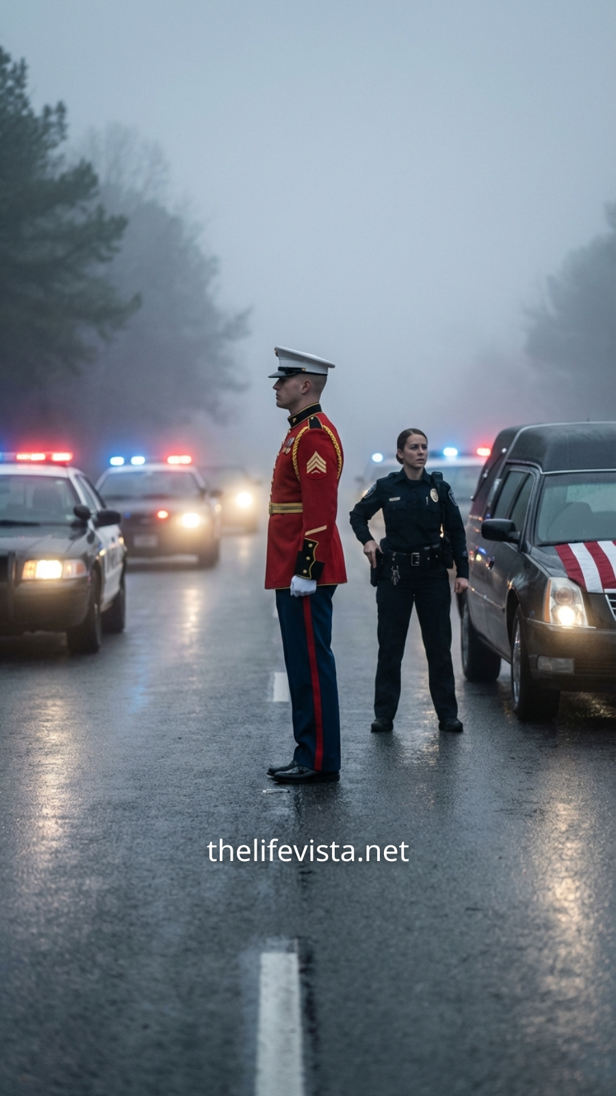 The convoy froze on a misty Virginia road, blue lights flashing through the fog. A young cop, hand on her holster, squared off against Sergeant Jacob Harper, his tomb guard uniform a blaze of scarlet and black. «You’re blocking the road, Sergeant.» – «Move the hearse, or I’ll have to arrest you.» Jacob didn’t blink, his eyes locked on the flag-draped casket behind him. «This is Private Ryan Mitchell’s final journey,» he said, voice like steel.