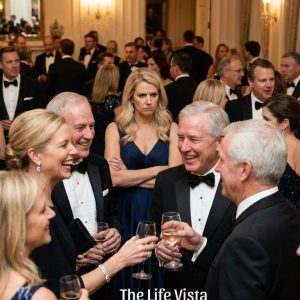 The chandelier lights in the vast ballroom shimmered like suspended constellations, casting warm reflections across the polished marble floor while soft laughter drifted gently through the air. Conversations overlapped in quiet waves as elegantly dressed guests moved through the hall with relaxed confidence. Crystal glasses clinked softly while servers carried silver trays between groups of people who spoke about business, travel, and art as though such luxuries were ordinary parts of life. Every detail of the room reflected effortless wealth, from the silk gowns brushing the marble to the polished shoes stepping carefully beneath the golden light. It was the kind of evening where money did not need to introduce itself because its presence was quietly visible everywhere.