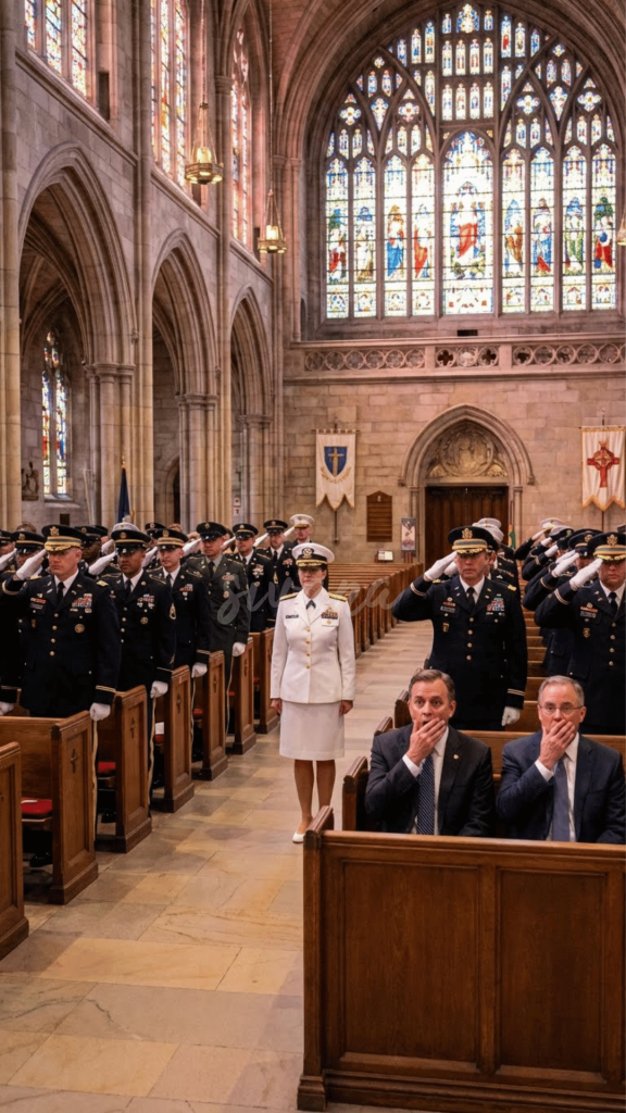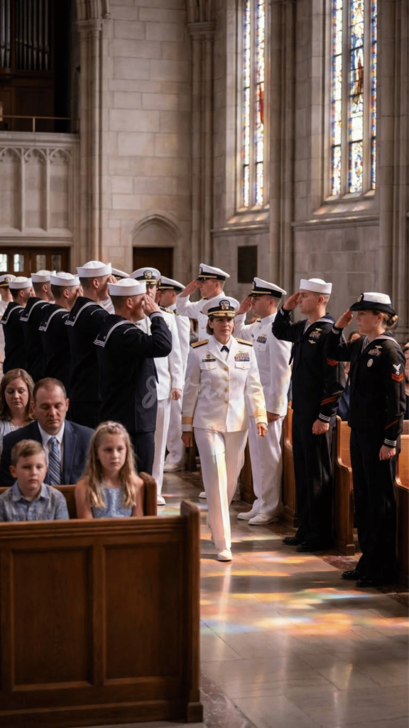 The chapel was filled with the soft echo of the organ. Then came a new sound: boots striking stone, sharp and deliberate. Two SEALs entered, their uniforms immaculate, and took their places at the front like statues.