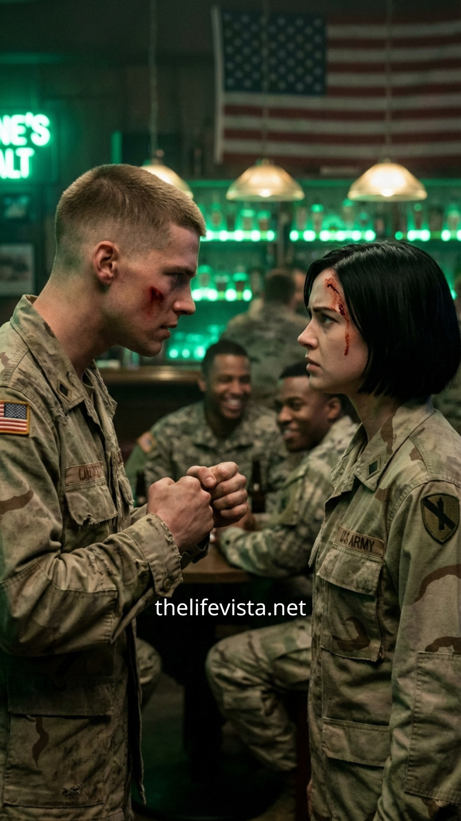 Four Army Rangers pushed through the door together, their presence loud even before it fully registered. At the center stood Staff Sergeant Mark Hollis—broad-shouldered, self-assured, carrying himself with the kind of swagger that grows stronger when others are watching. Their attention shifted almost instantly toward Elena—alone, composed, and unmistakably military.