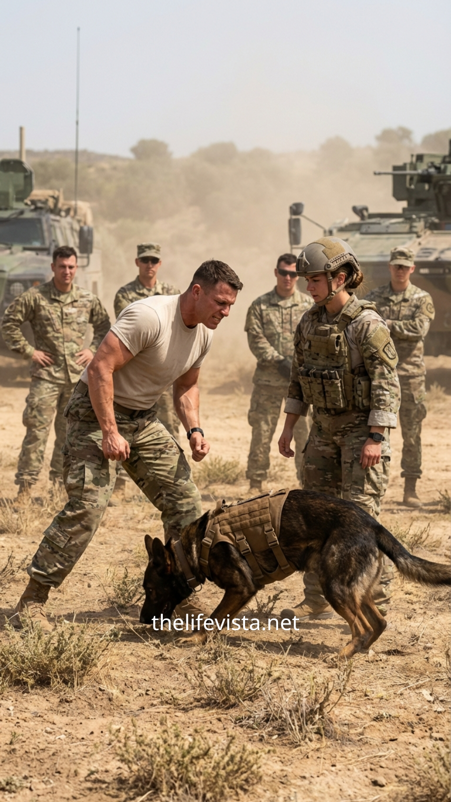Taryn’s hand tightened slightly—a single, precise signal—and Rook froze mid-motion, muscles taut, eyes locked onto the soldier, waiting for permission. That’s when the crowd understood: this wasn’t just a dog. This was a trained instrument, responsive to one person alone.