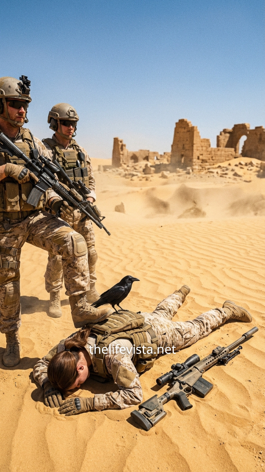 A single suppressed crack cut through the air. Claire’s body jolted sharply before collapsing sideways into the dust. Her rifle slipped from her grip.