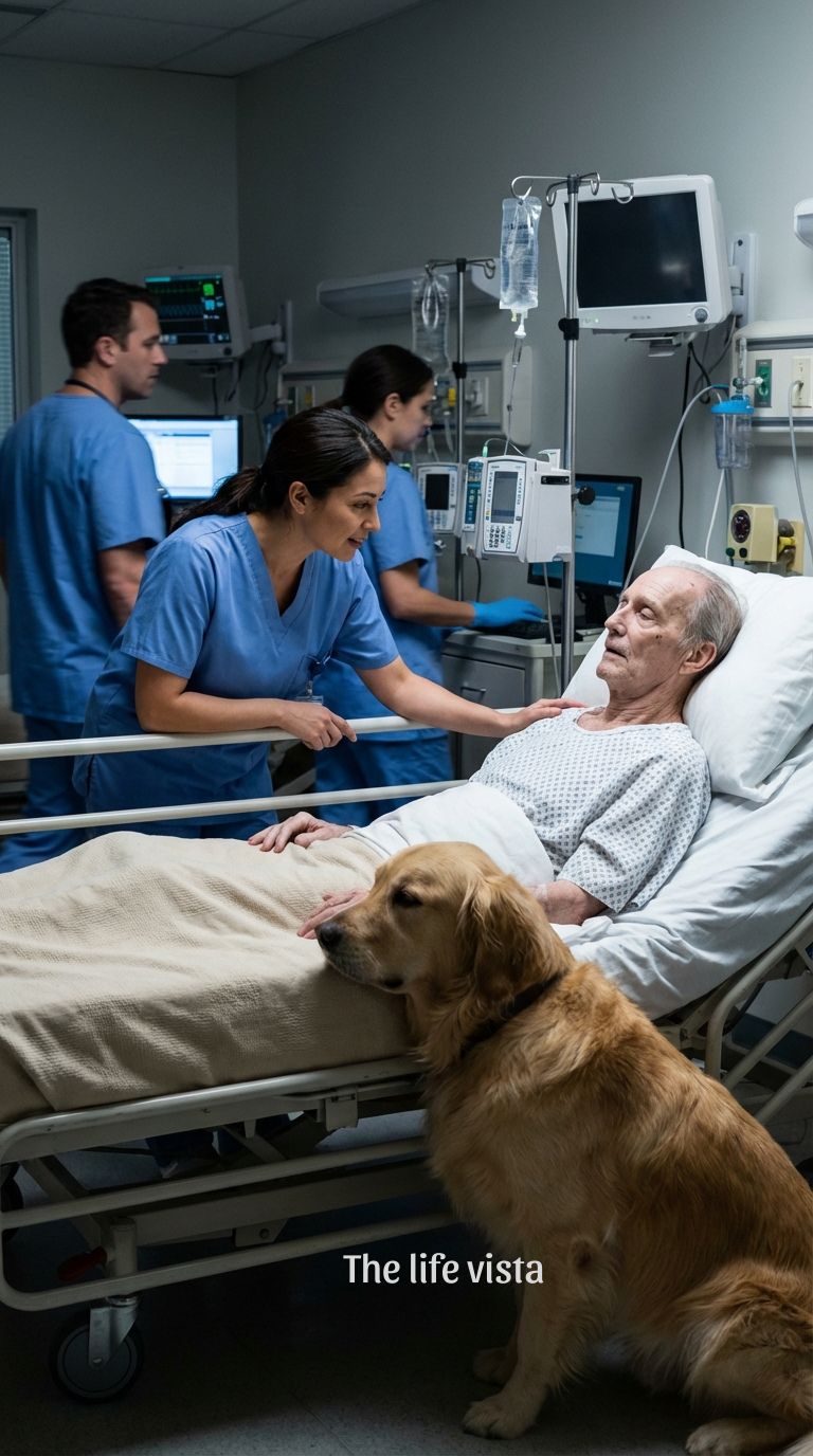 It started like most emergencies do—too fast, too loud, and somehow already too late. The ICU doors burst open with a gurney pushed at a speed that always signals urgency beyond words, and right behind it, slipping awkwardly through the chaos as if he didn’t quite belong in that sterile world, was a golden retriever. His fur was matted in places, his eyes wide with confusion and fear, but he stayed close, so close that one of the orderlies nearly tripped over him as they maneuvered the bed into position.