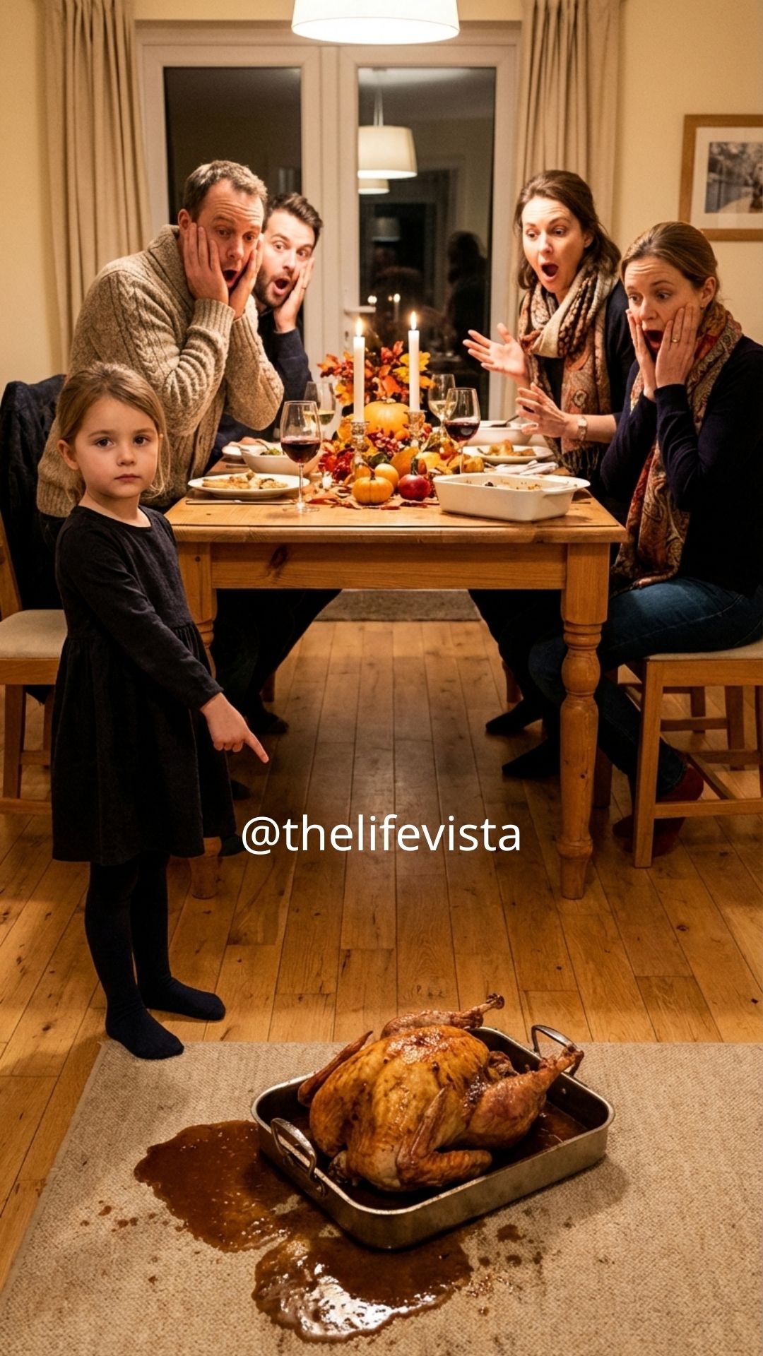 During Thanksgiving dinner, my five-year-old daughter let out a scream, ran to the table, and shoved the turkey straight onto the floor. Everyone froze in shock. I crouched down in front of her and gently asked why she did such a thing. She was panting, holding up her hands proudly. “Because I saved everyone,” she said. The room was filled with confusion.