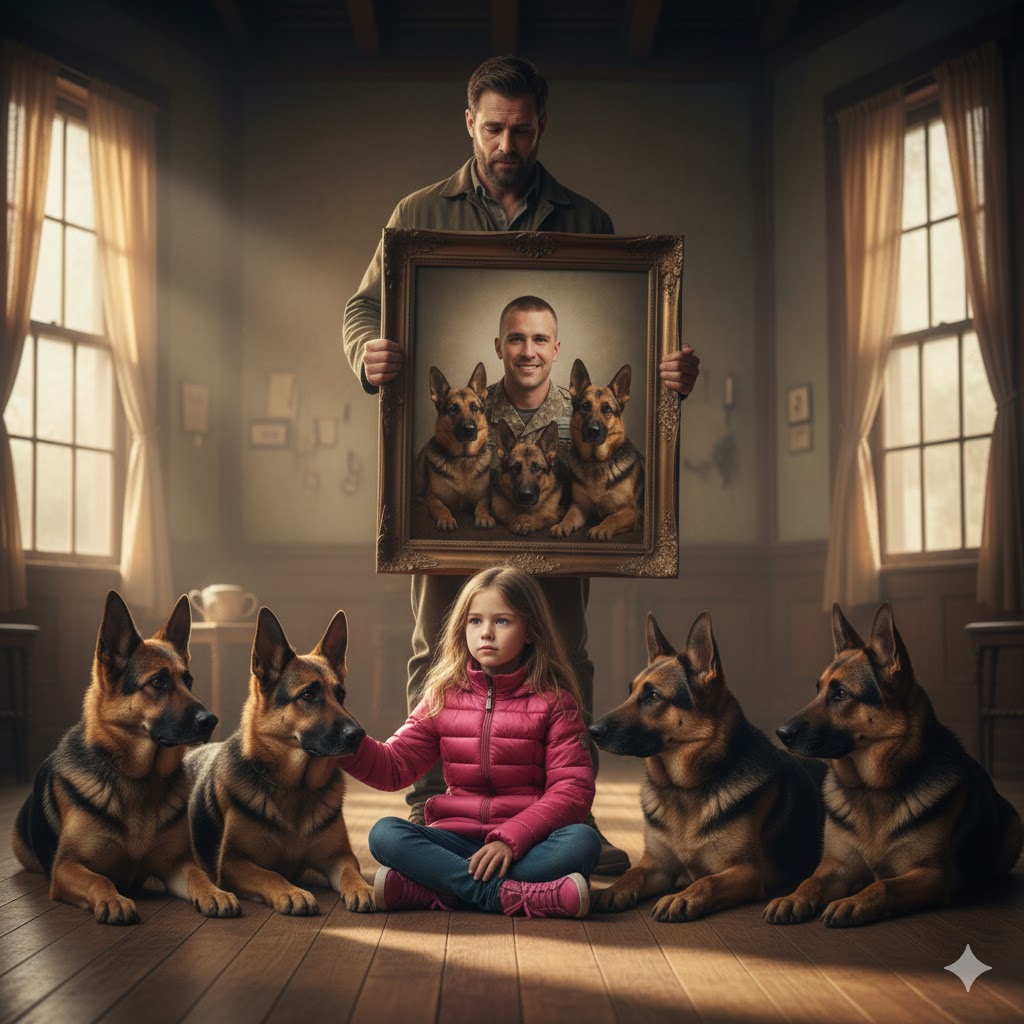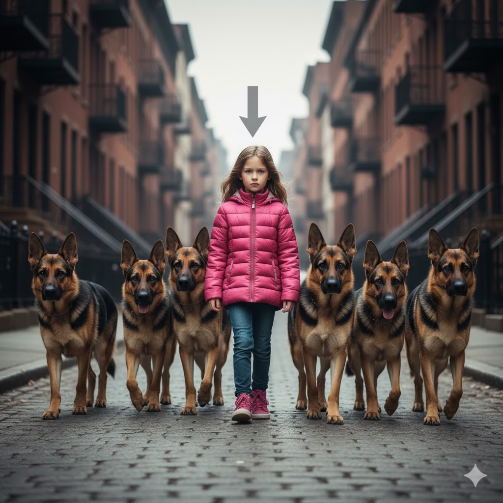 Every morning, at seven sharp, the clock over St. Mark’s would chime—and a little girl in a pink coat would appear once more on Maple Street, walking side by side with five loyal shepherds.