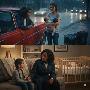 Inside, the air smelled of rain and fear. He found her curled up on a couch, flashlight flickering weakly, her soaked pink coat clinging to her small frame. Two dogs flanked her protectively. Bravo limped in, pressing his head against her arm until she smiled faintly.