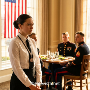 She Was Just the “Invisible” Lunch Lady Refilling Water Glasses, Until the General Noticed a Glimmer of Silver Under Her Apron That Made the Whole Room Go Silent.