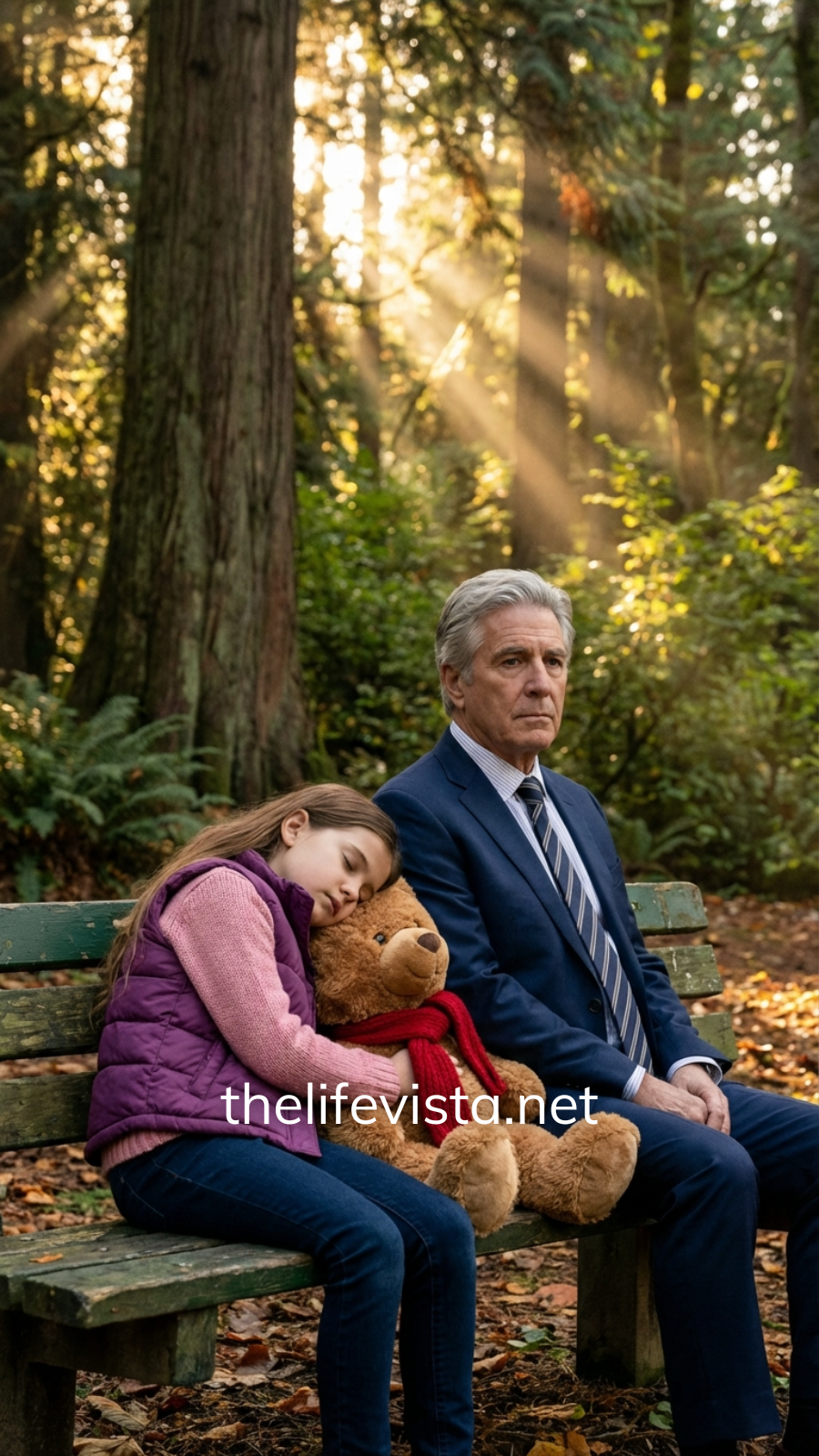 “Every night, a little girl curled up on the same park bench with her teddy bear. No pillow. No blanket. Just the cold night air. When a wealthy businessman finally stopped to ask why, her answer brought him to tears.”