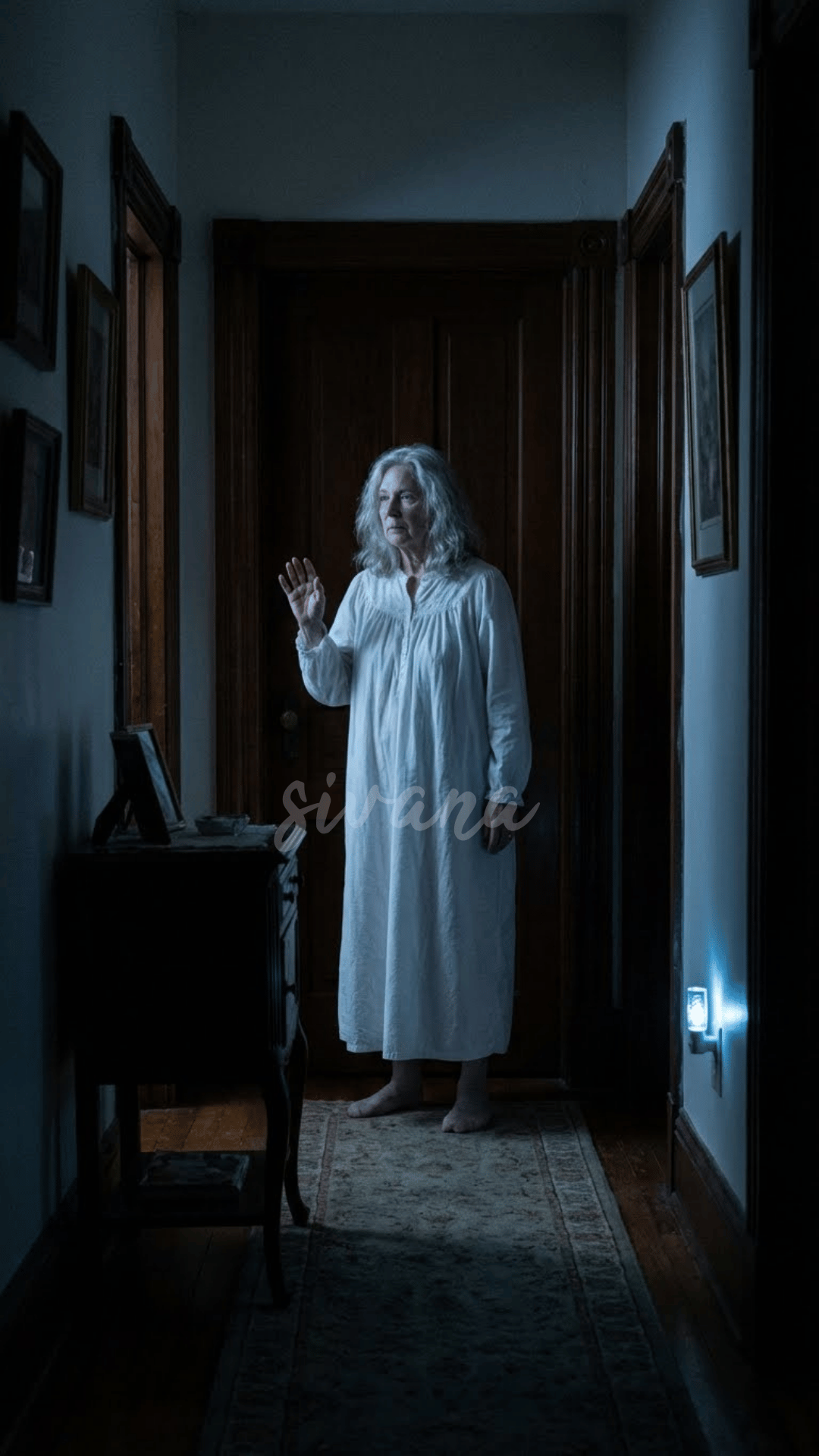 Helen, wearing a long white nightgown, stepped out of her room and slowly walked down the hallway. She stopped right in front of our door, looked around as if checking that no one could see her, and knocked three times. Then she just… stood there.