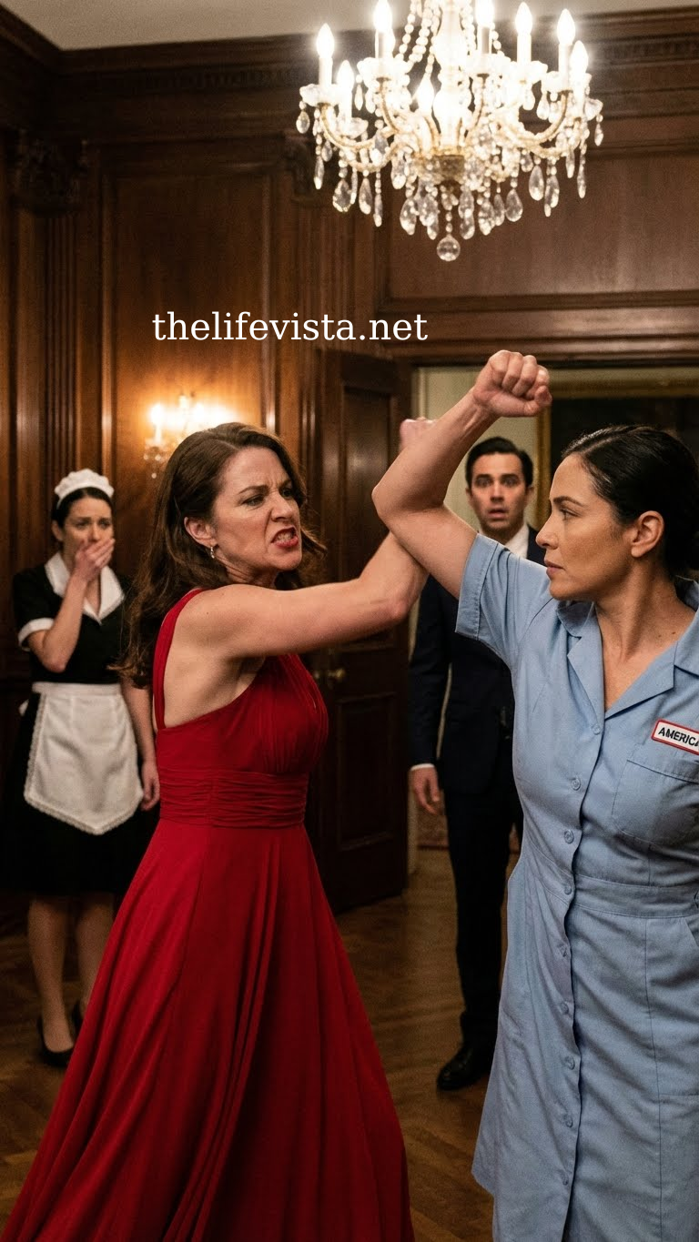 The entire mansion went silent, not because someone shouted, not because something broke, but because someone did the unthinkable. In the center of the grand living room, under the sparkling gold chandelier, Miss Victoria, the billionaire’s famous fiancée, raised her hand high and sharp, ready to slap another maid like she always did.