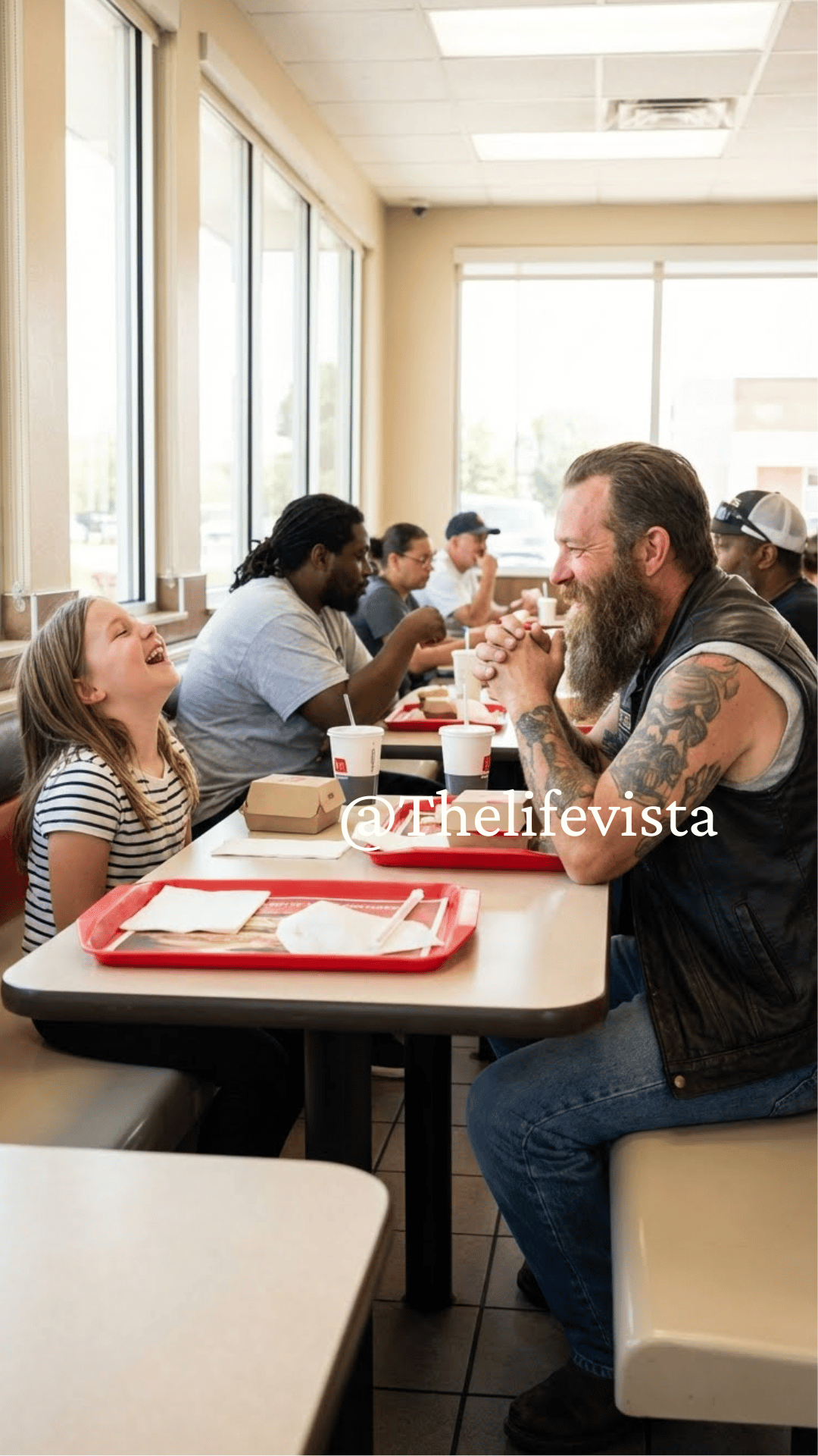 The leather-clad giant with skull tattoos and a scarred face had been coming for six months, always ordering two Happy Meals, always sitting at the same corner booth where this seven-year-old girl would show up exactly at noon.
