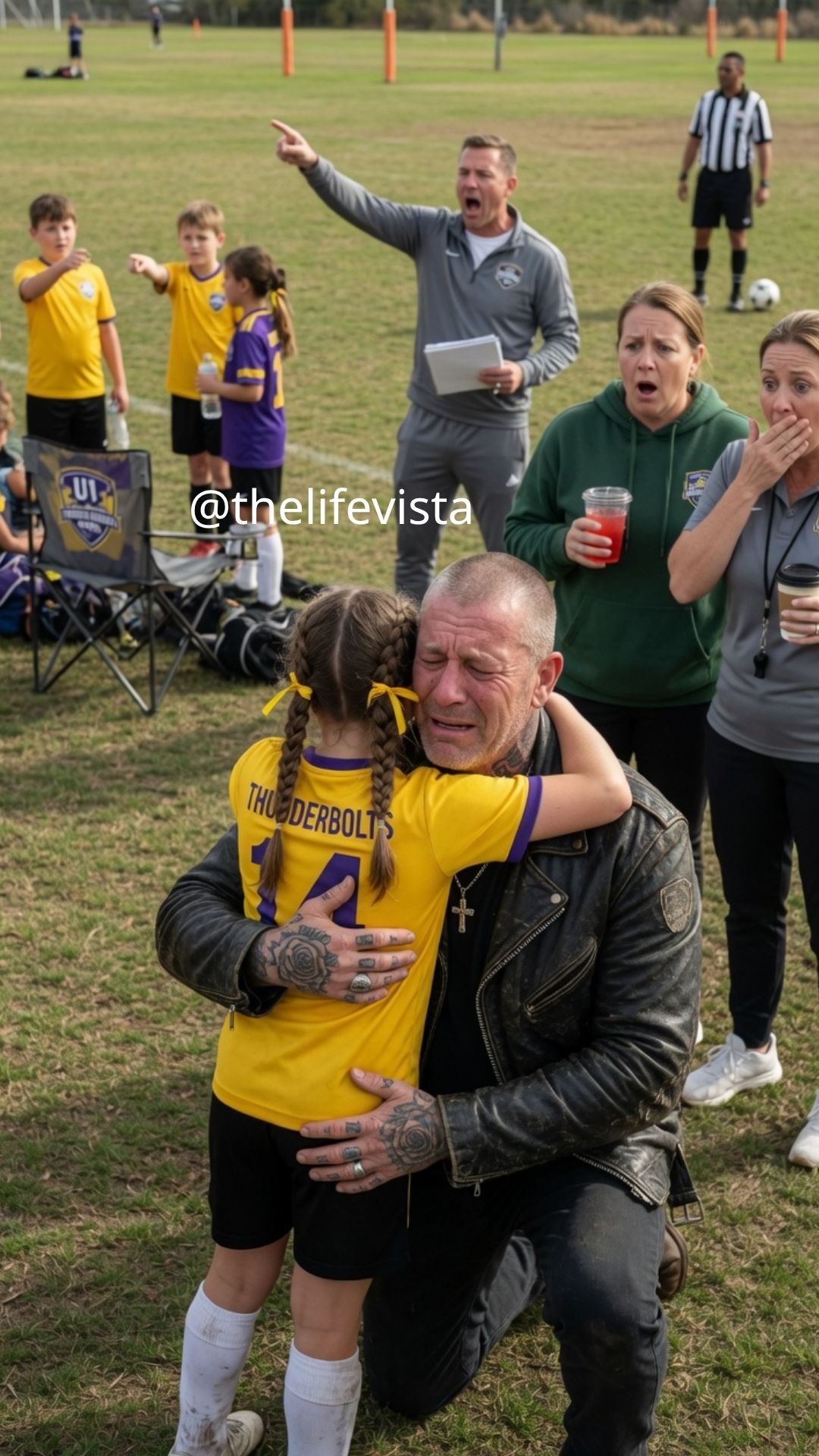 She froze mid-stride. The ball rolled past her. Every parent on the sideline was staring at me now, but I only saw her face — shock, then recognition, then something that broke my heart.