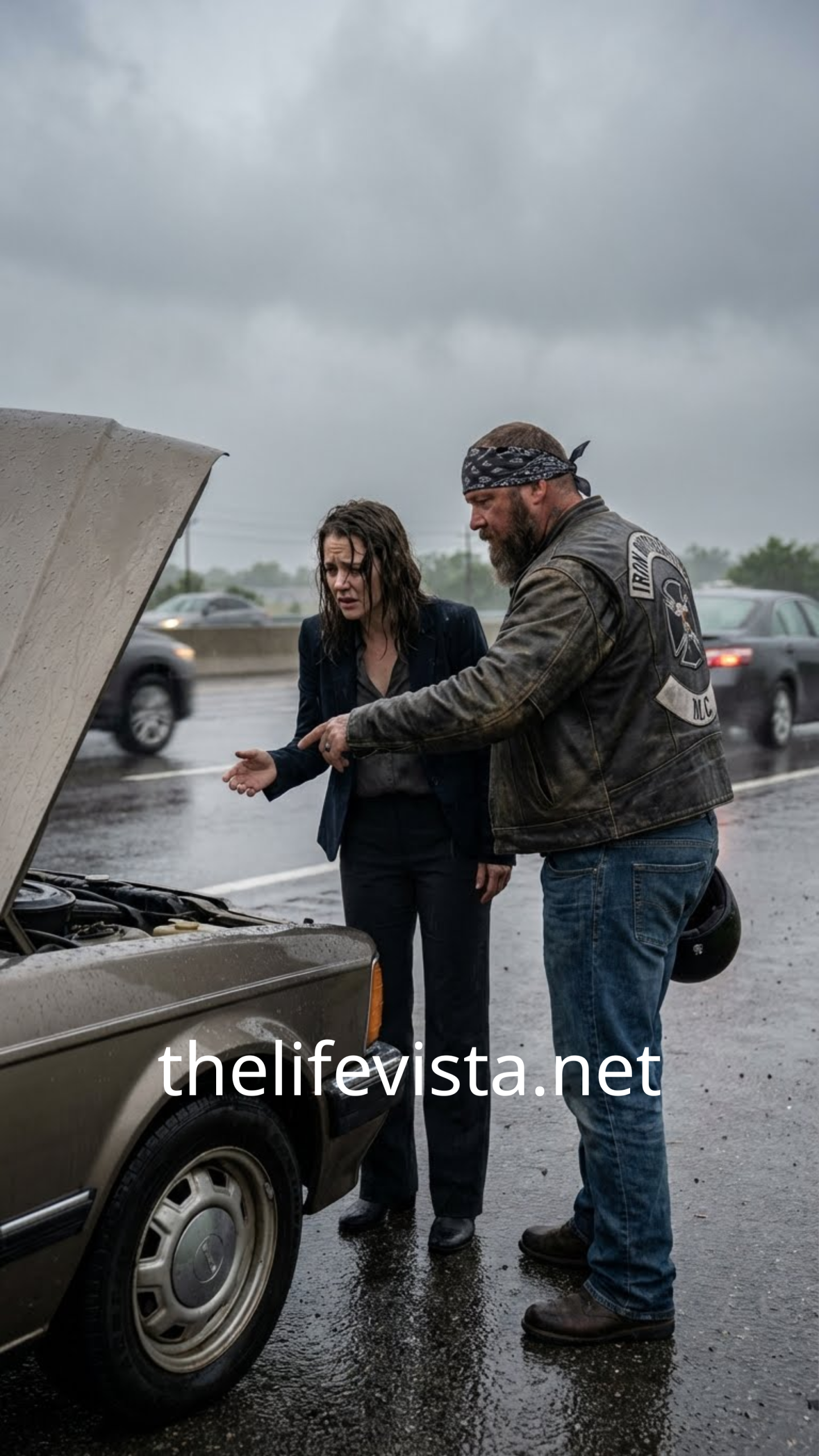 Every morning at exactly 6:40 a.m., the same battered black Harley thundered down Main Street. The sound came first—low, heavy, unavoidable—followed by the man himself. Leather jacket worn thin at the elbows. Faded patches stitched onto his back. A gray-streaked beard. A long scar pulling one side of his mouth downward, as if he were permanently caught between silence and a snarl.