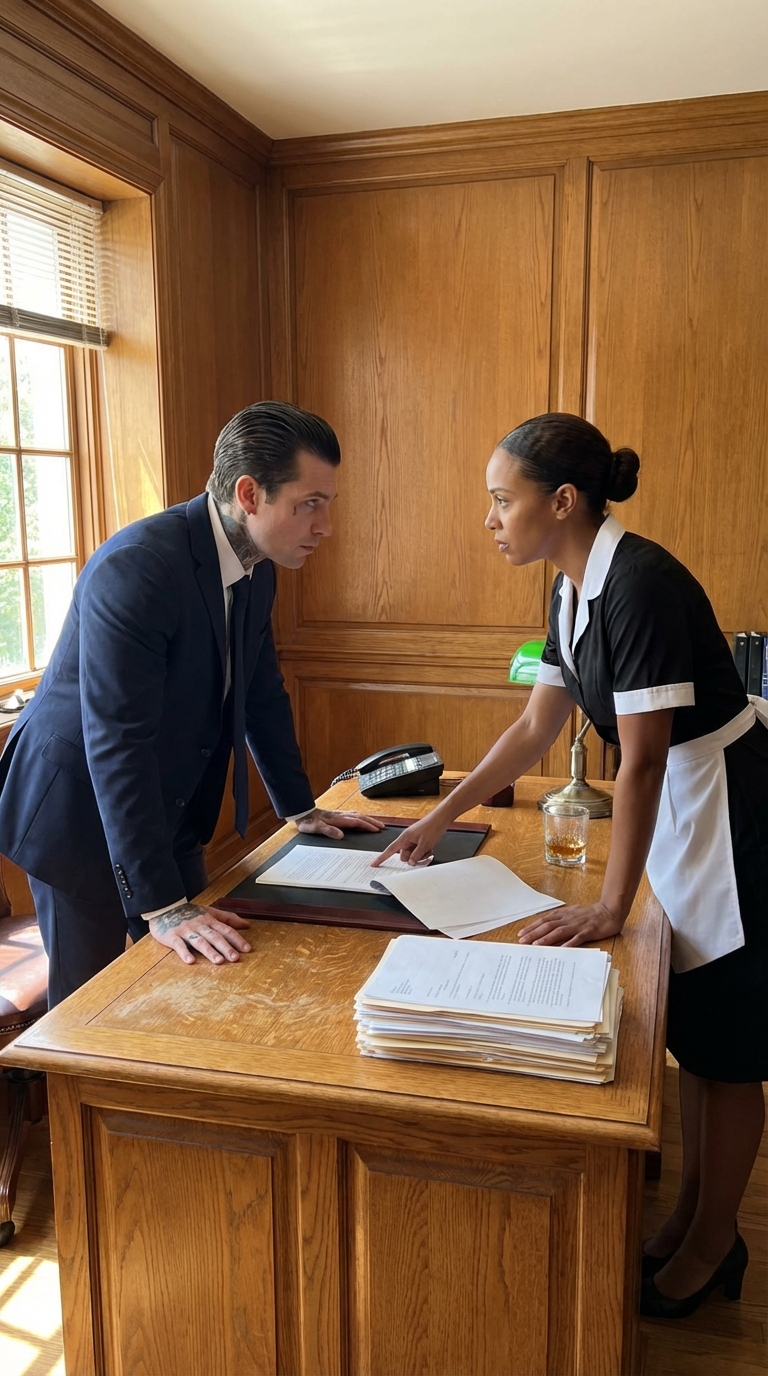 She was dusting the mahogany desk in Alexander Romano’s private study — the man whose name people in Chicago spat like an epithet and who wore his power like a second skin — when a line of legalese snagged her attention. She should have looked away. She never looked. But old habits of the mind are as stubborn as scars: her eyes, trained by long nights at Northwestern and longer nights at Morrison Webb, slid to section 7, subsection C. The language was quiet, almost polite in its phrasing, but it had teeth. It was the same syntax she’d seen years ago in a contract meant to eviscerate a company and destroy a career. A clause tilted to favor one party so perfectly it read like a trap set by hands that had practiced cruelty for profit. Her pulse spiked; the mop slipped from her grasp and she let it fall.